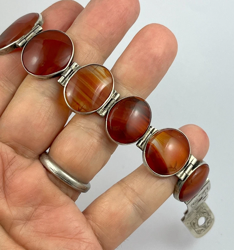 This is an stunning antique Victorian circa 1890, sterling silver Scottish agate belt buckle design bracelet. The stones are classic graduated banded carnelian agates from near Cupar in Fife. The bracelet has no hallmarks which is fairly normal for pieces from this period but has been fully tested and is sterling silver. The bracelet length is adjustable from approx. 15 cm ( six inches ) to 18 cm ( seven inches ) and the weight is 29.8 grams If when you receive your winning item and for any reason are not happy with the purchase please get in touch before leaving feedback and I will endeavour to resolve any issue you may have amicably. I have a returns policy which allows you to send any item back within 7 days of receipt. I always show high magnification pictures of my items to show as much detail as possible as it is not always possible to list every point in a description. As with all my auctions the bidding starts LOW and there is NO reserve! Please check out my other Jewellery auctions and remember that savings on shipping will be made for multiple purchases! I offer two shipping services to the UK and one worldwide. The special delivery (UK) and Airsure (worldwide) provides full insurance for any item.