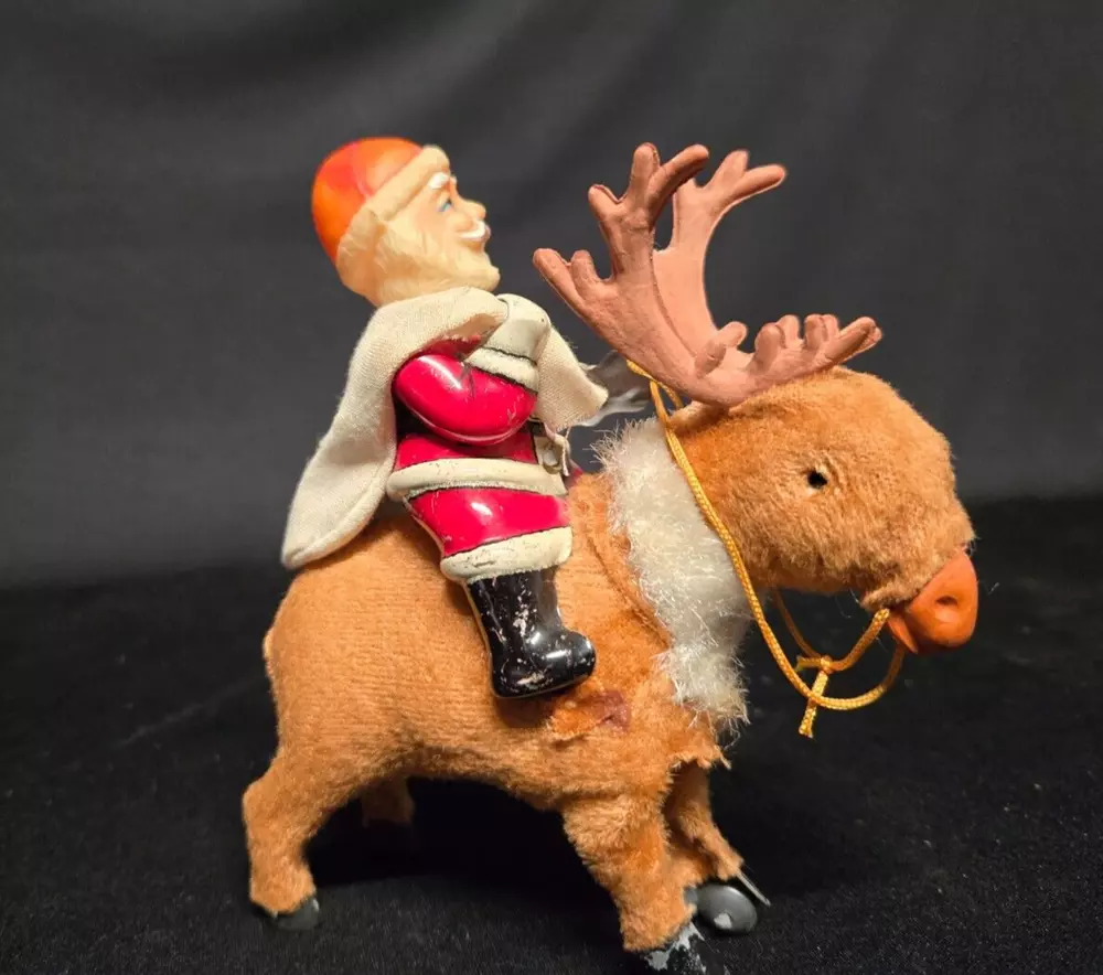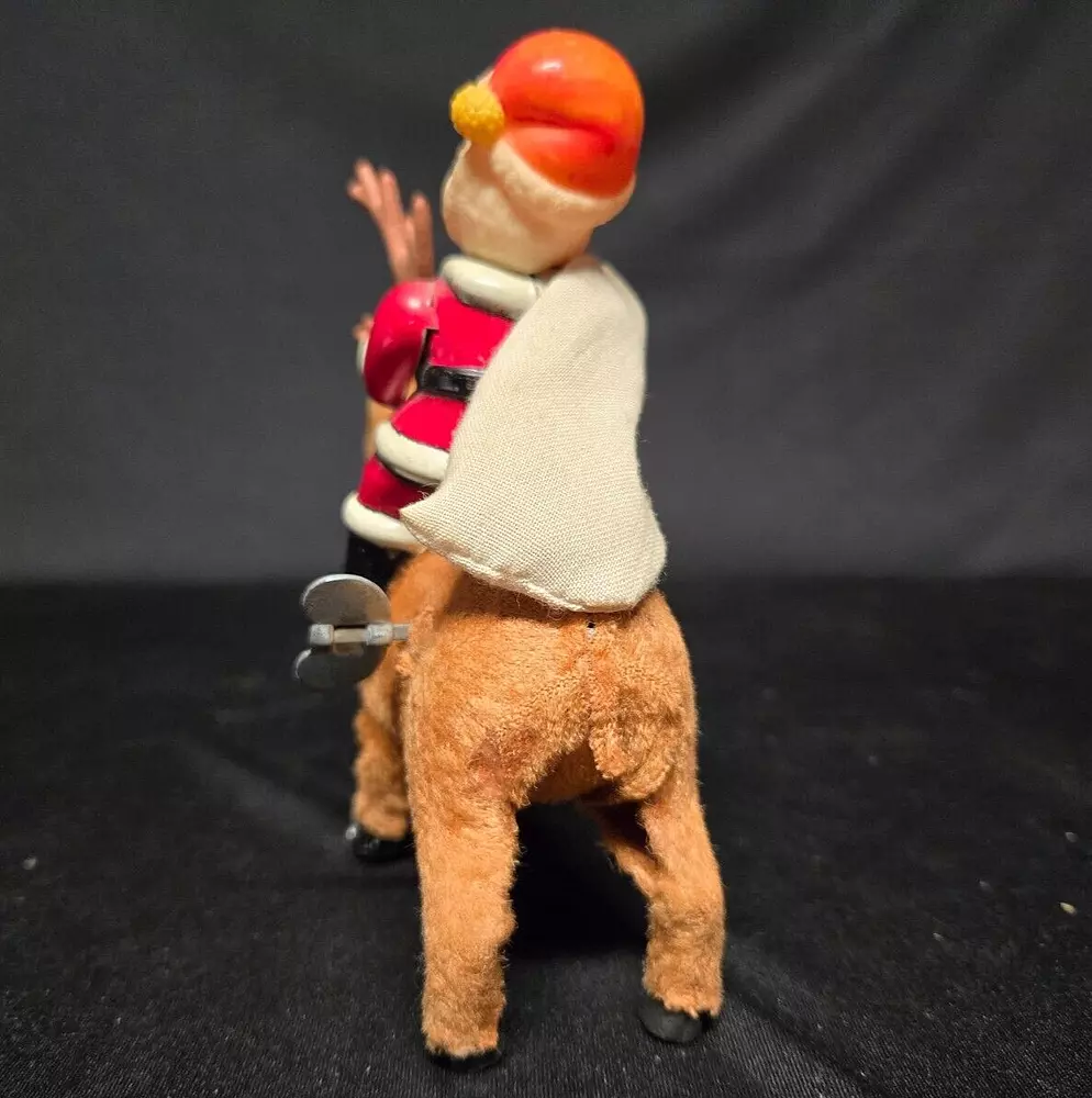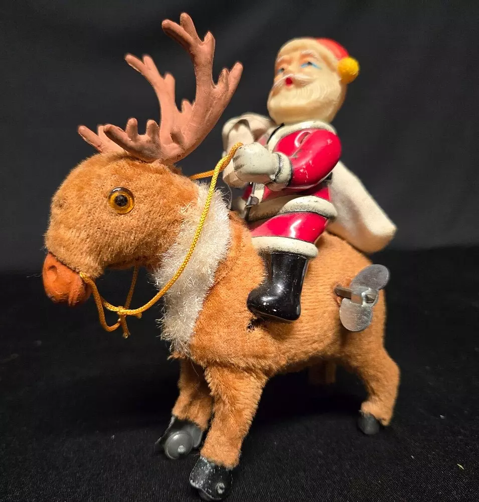 Excellent example of toys from the past! This is from the 1950's or so. Nice mixture of tin (body of deer and Santa), hard plastic (Santa's head), cloth (covering on deer and Santa's bag), and rubber (?)(deer antlers and nose). Rein is a thin gold colored silk cord. Deer is missing one eye (right side). Both antlers are present and complete. The wind-up key turns easily. I tried it once and the tension for the bouncing motion is there, but I had to tap the head of the deer to get him to move - and the key unwinds during that motion. It is old enough I didn't want to try to "make it work better" and will let the winning bidder figure it out! Wheels on the front hooves are secure. Sticker on the bottom indicates it was made in Japan. Stands about 5-1/2 inches tall and is about 5 inches long. Please ask questions before bidding as to alleviate any frustrations later on. * All items are used and sold "as is". I try to describe items as precisely as possible. I may not summarize every tiny detail but will make note of obvious imperfections as well as highlight any remarkable qualities an item may have. If you have questions, PLEASE ASK BEFORE BIDDING OR PURCHASING. * Your newly purchased item(s) are YOUR newest "finds" and I will do my best to package each and every item carefully - always thinking about how I would want it to be cushioned/secured/protected if I was the one opening it up after winning the bid! * We will accept returns if item is found to be significantly different than described. Asking questions before purchasing assures that you are getting what you want and saves both of us a lot of time and trouble to return. * Item(s) must be paid for within 7 days of end of auction date. If payment not received, item will be relisted. * I will ship your item as soon as I can - most likely within one business day but no longer than three business days - after payment is confirmed. * We will accept USA personal checks but prefer PayPal . If paying by personal check, items will only be shipped after the check clears the bank. A check returned for non-sufficient funds which incurs bank fees will be charged to buyer and must be paid before the item is shipped. * MN residents pay 6.88% sales tax. Thank you for visiting our site and looking through our items. We hope you find something you are looking for! God Bless!