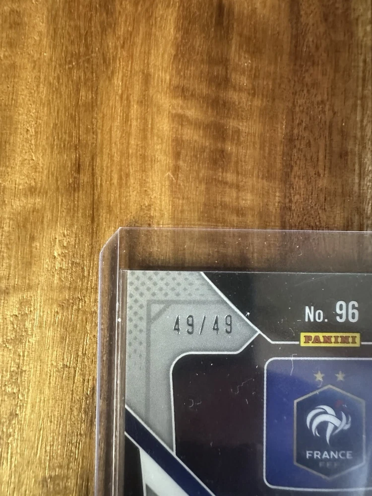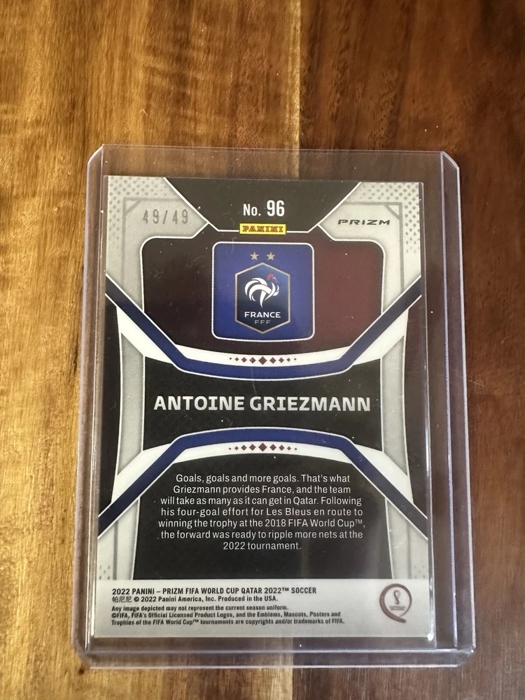 The product is a 2022 Panini Prizm World Cup Qatar trading card of soccer player Antoine Griezmann from the French national team. This specific card is a parallel variety with a Prizm finish and is serial numbered as 49 out of 49. The card is in near mint or better condition and is part of a set featuring players from the FIFA World Cup. It does not feature an autograph and is manufactured by Panini.