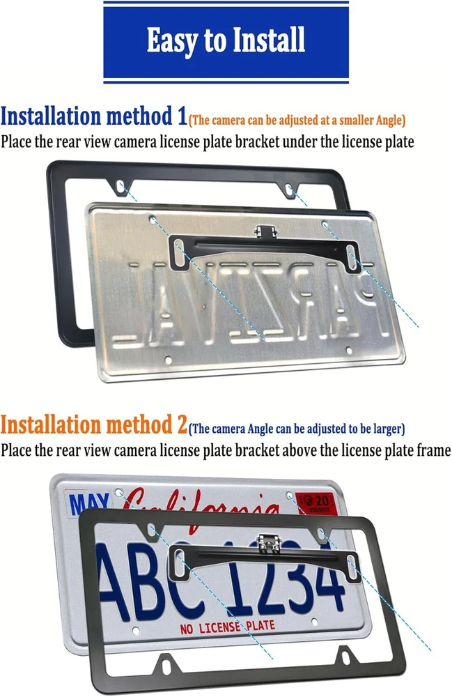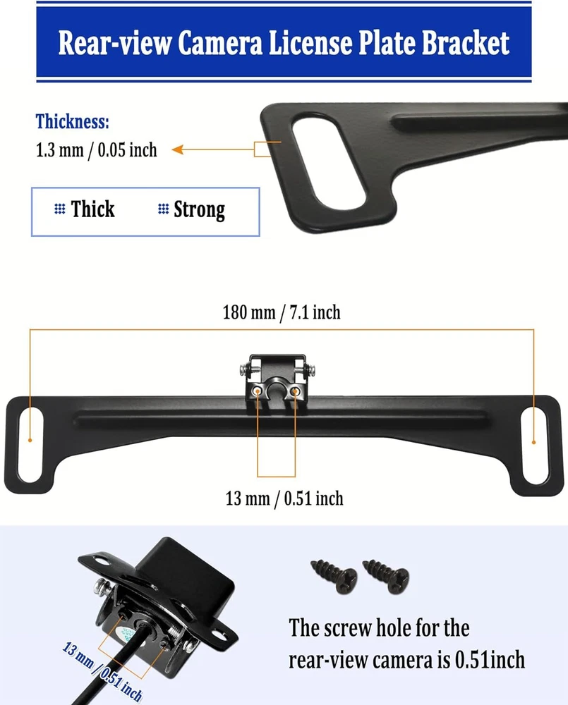 Aootf Universal Car Rear View Camera License Plate Bracket Kit, Black Product Details Color: Black Brand: AOOTF Vehicle Service Type: Car Product Dimensions: 12"L x 6"W Finish Type: Powder Coated Manufacturer: Aootf Item Weight: 4.6 ounces Manufacturer Part Number: XE-License Plate Frame Color: Black Brand: AOOTF Vehicle Service Type: Car Product Dimensions: 12"L x 6"W Finish Type: Powder Coated MaterialFit Type: AluminumUniversal Fit Backup Camera License Plate Mount- this backup camera bracket kit includes reverse camera license plate holder, license plate frame and installing screws caps, only for the installation of dash cam mirror camera , fit most vehicles. Universal Reverse Camera Bracket- The distance between the 2 screws holes of this back up camera bracket is 13mm(0.51 inch), please confirm the screws spacing of your reversing camera is 13mm as well. This dash cam rear view mirror bracket can be only applied to US car tag plates. Please note that do not install your backup camera upside down, you should test picture before installing. Black License Plate Frame- Made of sturdy aluminum, which is Light weight and has good toughness, providing long-lasting protection from corroding, rusting, and aging. 1.6 mm thick aluminum, Black Matte Powder Coated, UV resistant, will not fade, keeps your license plate cool and sparkling. Easy to Install- 2 installation methods: one is to install the camera bracket on the back of the license plate, the angle of the camera's up and down adjustment is relatively small; Another option is to install the camera on the front of the license plate frame, which will result in a larger angle for the camera to be adjusted up and down. No drilling required After Sales- This license plate camera mount kit includes all mounting hardware required for rear view camera and license plate- screws, caps, wrench and license plate pads. Please contact us if you have any questions, and we will actively provide the most suitable solution for you.