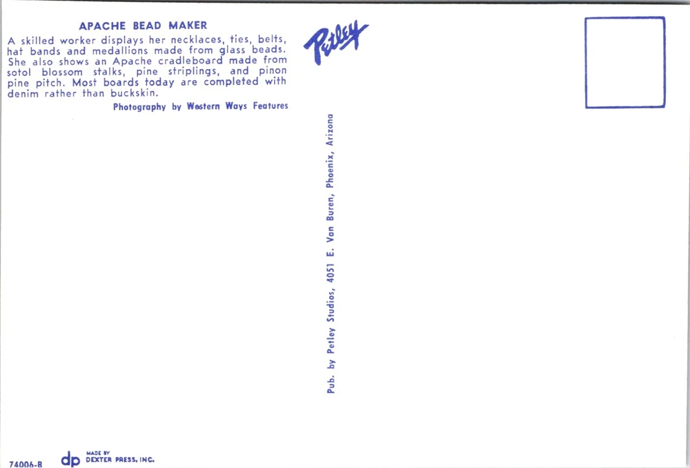 Apache Bead Maker with Traditional Native American Cradleboard Postcard 24233 Front of Card: The image shows a person sitting on the ground outdoors, engaged in what appears to be a traditional craft activity. The person is wearing a blue dress with intricate patterns and is holding a piece of fabric or ribbon. There is a woven basket-like structure, possibly a cradleboard, leaning against a tree next to the person. The background includes green vegetation and a tree trunk, suggesting a natural setting. This image is interesting and relevant as it depicts traditional craftsmanship and cultural attire, highlighting the importance of preserving and showcasing cultural heritage and practices. Back of Card: The image is a postcard with text on it. The text reads: APACHE BEAD MAKER A skilled worker displays her necklaces, ties, belts, hat bands and medallions made from glass beads. She also shows an Apache cradleboard made from sotol blossom stalks, pine striplings, and pinon pine pitch. Most boards today are completed with denim rather than buckskin. Photography by Western Ways Features There is also a logo that reads "Petley" and additional text along the side that reads "Pub. by Petley Studios, 4051 E. Van Buren, Phoenix, Arizona." At the bottom, there is text that reads "74006-B" and "MADE BY DEXTER PRESS, INC." This image showcases traditional Apache beadwork and craftsmanship.