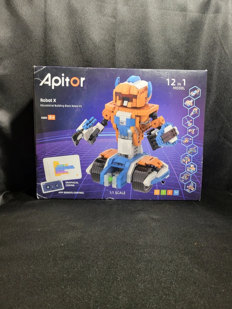 12-in-1 Advanced-level Robotics Kit】Robot X includes 600+ blocks, 1 control unit with 7 multicolor LED lights, 2 infrared sensors, 1 color sensors, and 3 motors, that kids can build and rebuild into 12 cool robots. Perfect gift for 8+ year old boys and girls. (3 x AA batteries are required and not included) 【Programmable APP RC Robot】With the free Apitor Kit app from App Store and Play Store, kids can control the motorized robot to move in all directions, left, right, forward and backward and 360 degree rotating stunt. Let kids explore more fun gameplay in the App! (An iOS and Android phone or tablet is required and not included) 【Graphical Programming Learning】With the drag and drop coding interface, kids easily learn how to program their robot to follow lines, avoid obstacles, detect distance, control LED lights, and more, on Apitor Robot app following the step by step instruction. Moreover, kids develop their logical thinking, the creativity of problem solving, and learn the knowledge of science, technology, engineering and mathematics. 【Works With Major Building Block Toys】Kids can combine the Apitor Kit with their existing building blocks to create more powerful and funny motorized robots, and use the Apitor Robot app to control their own creations. Clear instructions are included to help kids build. We recommend that parents and children create the first robot together, which will make a lot of sense. Stem toys for boys aged 8 9 10 11 12+. Introuce kids to the creative world of coding with Apitor Robot X 12 in 1 robot kit, the best educational building block STEM toys. The kids learn to build, program and create while they are having fun. It is an interesting and educational stem project toys for ages 8-12, and also a perfect gift for birthdays, Christmas, Children's Day, and other special occasions.