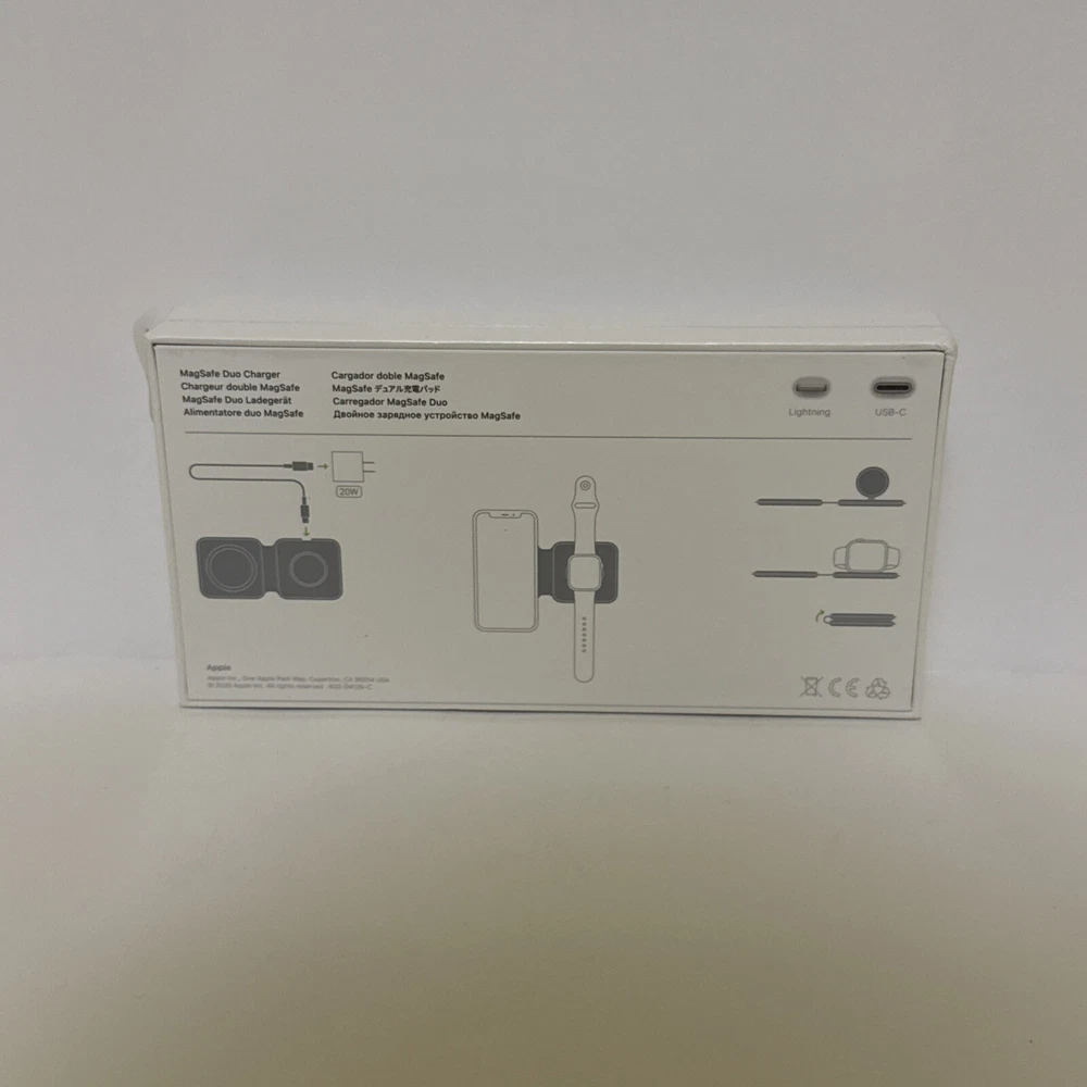 Retail $129 The MagSafe Duo Charger conveniently charges your compatible iPhone, Apple Watch, Wireless Charging Case for AirPods, and other Qi-certified devices. Just place your devices on the charger and a steady, efficient charge begins on contact. The charger folds together neatly so you can easily take it with you wherever you go. MagSafe Duo Charger can be used to wirelessly charge your iPhone 8 or later, Apple Watch, AirPods models with a wireless charging, as you would with any Qi-certified charger Recommended: 20W USB-C Power Adapter (sold separately) What's in the Box: MagSafe Duo Charger USB-C to Lightning Cable (1 m)