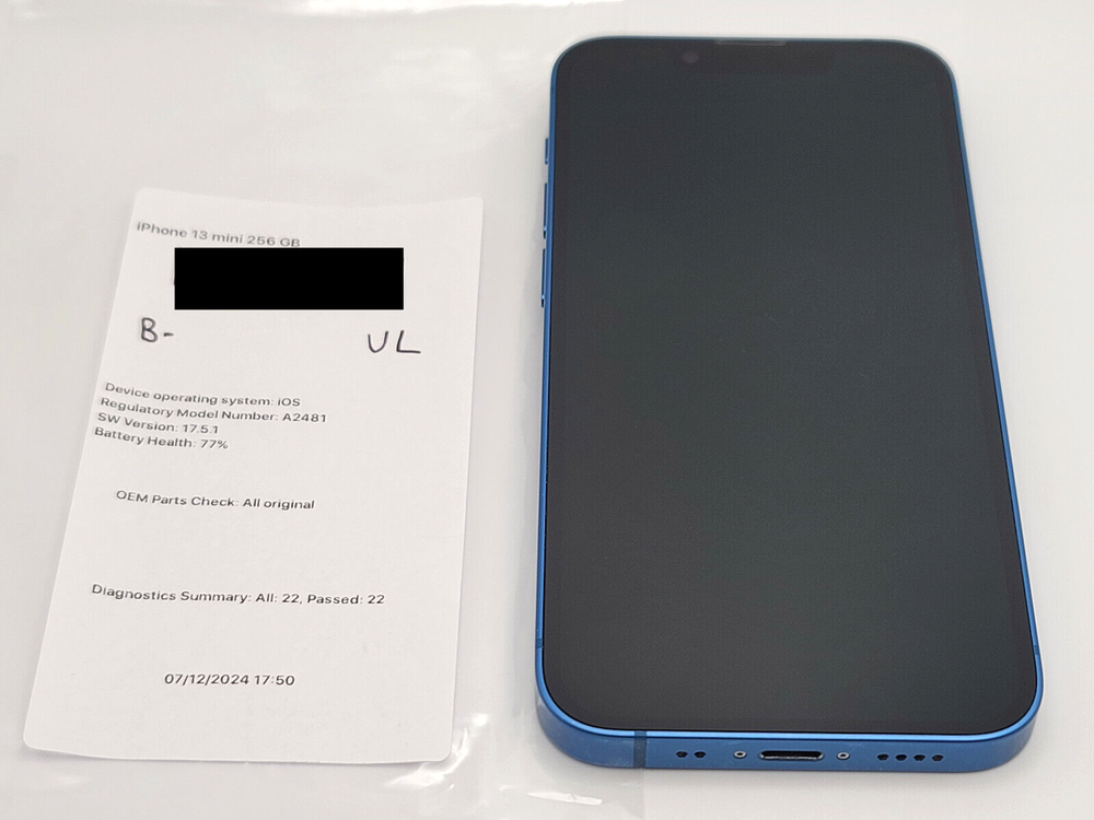 You are bidding on an Unlocked iPhone 13 mini 256 GB! Device is in fair condition with signs of wear and use. Device has several scratches on front screen and some case wear. Please see the pictures for more detail. Battery Health 77% iOS Version: 17.5.1 Device has passed all functionality testing and is completely original. This device is factory unlocked for use on all compatible wireless carriers domestic and international. We guarantee full functionality (unless stated otherwise) on all of our devices and use state of the art industry software to test every function of each device. Devices will ship same day for purchases made by 2PM EST. Listing is for device only and does not include accessories (charger, etc.) All devices we sell are completely manufacturer original (OEM) and not refurbished unless stated otherwise in listing. If listing includes accessories they will also be manufacturer original OEM accessories unless stated otherwise. All products are guaranteed fully functional for up to 30 days after delivery. Device must be returned in the same condition it was shipped (I.E. No missing plastic or accessories). All buyers with less than 5 feedback and less than 30 days on eBay must contact us first before purchasing. All sales will be canceled for buyers who do not contact us first. Please read description carefully and ask all questions prior to purchasing. Please contact us prior to opening a case or leaving negative feedback, if in the very off chance there is something wrong with your order we will ALWAYS make it right 100% of the time! We have been in the electronics wholesale/retail industry for more than 10 years and have the experience and expertise to provide unwavering quality and customer support. Buy with confidence and keep in mind that every purchase is backed by our 30 day warranty guarantee!