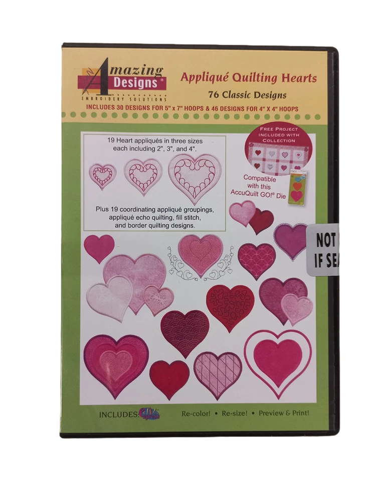 Appliqué Quilting Hearts - Amazing Designs - Machine Embroidery - 76 Classic Designs - CD # ADC-191 CD # ADC-191 - New, Sealed, Original Packaging 76 professionally digitized designs -Includes easy to follow color run information 30 Designs For 4" x 4" Hoop sizes & 46 Designs For 5" x 7" Hoop sizes Compatible with : ART BKF DST EMD EXP HUS JEF PES SHV VIP XXX NCT Thrift Store New Creation Trades, Inc (NCT) is the 501(c3) all-volunteer non-profit that sponsors OxCart MarketPlace and the artisans that list their hand/machine crafted products on OxCart MarketPlace. Artisans receive the full net-proceeds from the sale of their individually listed products. Donated repurposed textile materials are incorporated into these products at no charge to the artisan. Items Donated to NCT that are not directly useful for training purposes or product creation are offered by New Creation Trades for sale through the NCT Thrift Store. Proceeds from these sales support the overhead expenses of OxCart MarketPlace, Thank you for supporting OxCart Artisans with your purchases through NCT Thrift Store!