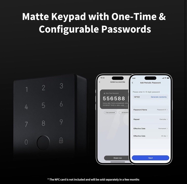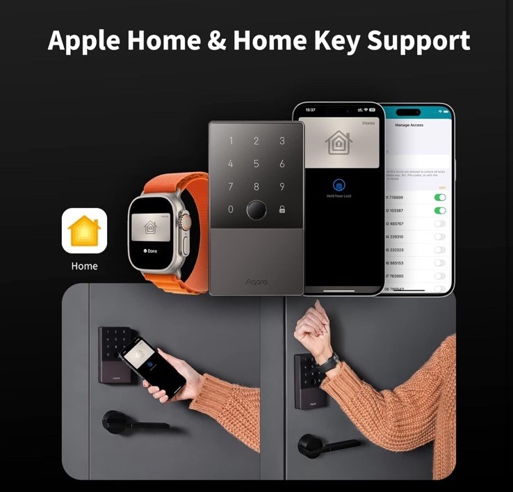 Apple Home and Home Key Support】The U100 is a smart door lock that is fully integrated into Apple Home. It can be unlocked with the Apple home keys by simply tapping an iPhone or Apple Watch, even when the iPhone or Apple Watch is out of power. Moreover, you can manage and share door access for your guests in Apple Home. 【Fingerprint and More Ways to Unlock】The Smart Lock U100 offers multiple ways to unlock, including a high-precision fingerprint reader for up to 50 fingerprints, remotely configurable passwords via the Aqara Home app (An Aqara Zigbee 3.0 hub is required), one-time local passwords for visitors, and a mechanical key for emergency use. * The NFC card is not included and is sold separately. 【Automations with Aqara and Third-Party Devices】With an Aqara Zigbee 3.0 hub, the Smart Door Lock U100 is compatible with third-party ecosystems like Google Home, Alexa, IFTTT as well as the Aqara Home app, allowing it to be easily integrated into a wide range of smart home setups and used in smart home automations. For example, when someone presses the Aqara Video Doorbell G4, you will be able to view who is at your door and easily unlock the U100. 【Auto Lock & Do Not Disturb Mode】Thanks to the built-in gyroscope inside the lock, the auto-lock feature locks the door for you after you close it. Alternatively, you can disable this feature and leave the door always open. Also, the Do Not Disturb mode can mute the door lock sounds within a certain period of time, to avoid affecting your family’s sleep when you get back home late. 【A Durable and Secure Biometric door Lock with Long Battery Life】 The U100 is powered by 4 AA 1.5V batteries (included) and has a long battery life of up to 8 months. Also, a USB-C port for emergency charging is available. The lock body made of zinc alloy has an IP65 rating and complies with the same safety standard as BHMA Level 3. It’s capable of withstanding temperatures ranging from -31°F to 151°F. Your sensitive data (e.g., fingerprints) is stored locally and fully AES encrypted.