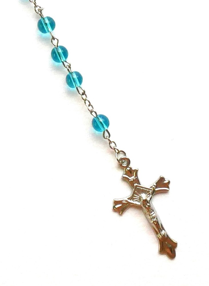 Aqua Beads Pressed Glass Rosary with Pouch Included This is one of the best rosaries you can buy...all glass...heavier than other rosaries. PLEASE NOTE THAT THIS ROSARY IS NOT INTENDED TO BE USED AS A NECKLACE ROSARY AND WE DON'T RECOMMEND TO USE IT AS SUCH. This listing includes (1) rosary. SIZE/LENGTH: Total length is 19" (27" circumference) including the Crucifix. BEADS: Quality 6 mm (1/4") pressed glass round beads carefully assembled on a zinc alloy chain. CENTER PIECE: Zinc alloy center piece of The Madonna measures 5/8" x 3/8" CRUCIFIX: The Crucifix measures 1-1/2" L x 7/8" W. This rosary includes a FREE pouch that may be black or blue. Come Visit Us at Our New Store! Please feel free to email me with questions about this item. Also please check my other listings. I am always available to answer your questions promptly. Buy from us with confidence.