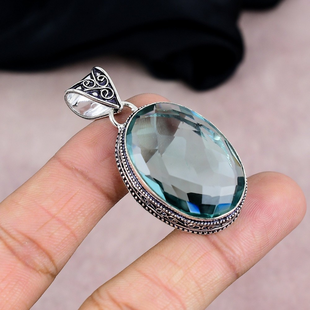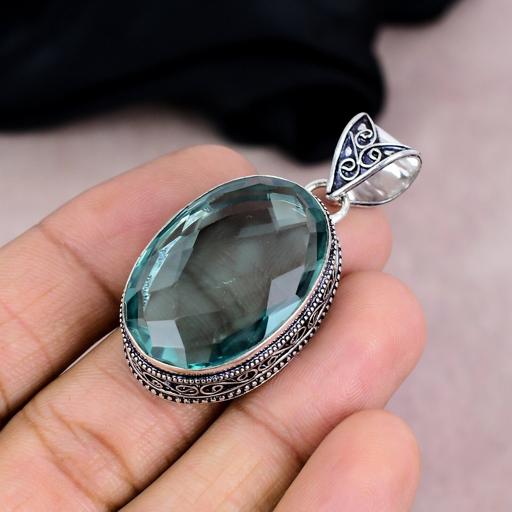 Main Stone Shape:OvalDiamond Color Grade:N/AMetal:Sterling SilverMaterial:GemstoneTheme:Beauty, Bohemian, Ethnic, Halloween, Love, NatureCut Grade:N/ATotal Carat Weight:10 carat and aboveMain Stone Creation:Lab-CreatedNecklace Length:5"Secondary Stone:N/ANumber of Diamonds:N/AMain Stone Treatment:Not EnhancedMain Stone Color:BlueClosure:Same As PicturePendant Shape:Same As PictureMain Stone:AquamarineFeatures:HandmadeDiamond Clarity Grade:N/AStyle:PendantCountry of Origin:IndiaNumber of Gemstones:1Occasion:Anniversary, Birthday, Christening, Christmas, Engagement, Father's Day, Graduation, Mother's Day, Valentine's Day, WeddingBrand:HandmadeCollection:HandmadeColor:SilverPendant/Locket Type:Same As PictureChain Type:N/AType:PendantCertification:N/ABase Metal:Sterling SilverSetting Style:BezelMetal Purity:925Country/Region of Manufacture:IndiaColored Diamond Intensity:N/A