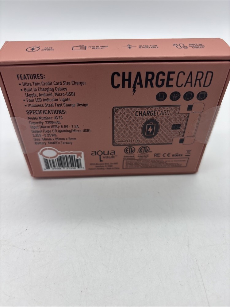Keep your phone charged on-the-go with this Aquavault Credit Card Size Portable Phone Charger. With a high capacity of 2300mAh and ultra-fast charging technology of 1.5A, you can rely on this power bank to keep your phone running all day. The sleek minimalist design with stainless steel finish is compatible with both Apple and Android devices and comes with a charging cable for added convenience. At only 3.3 inches in length and 0.18 inches in height, this power bank is incredibly portable and easy to carry with you wherever you go. The single USB-C and Micro-USB port allows for simple connectivity, and the unit is designed to withstand the wear and tear of everyday use. Get the convenience and peace of mind you need while traveling or out and about, with the Aquavault Credit Card Size Portable Phone Charger. See photos
