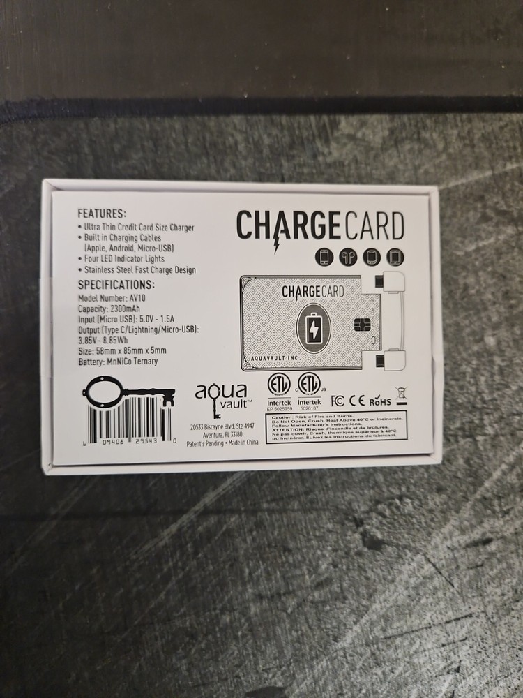 Aquavault Credit Card Size 2300mAh Portable Fast 1.5V Phone Charger Platinum new with slight wear and tear on box fast shipping from alabama