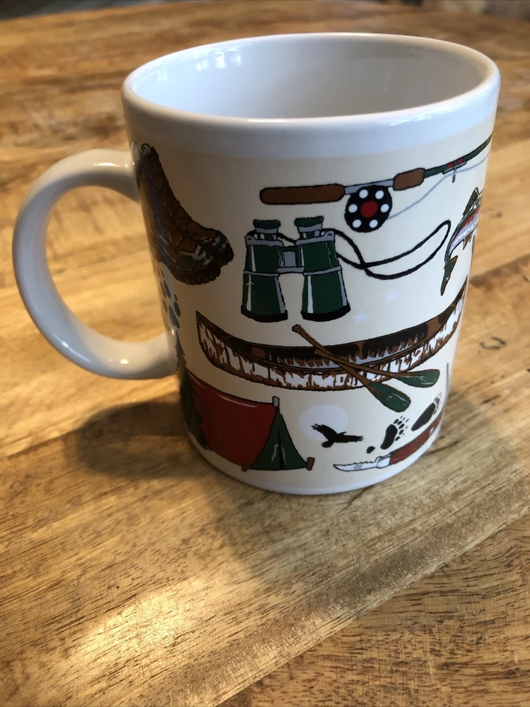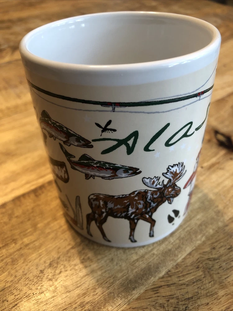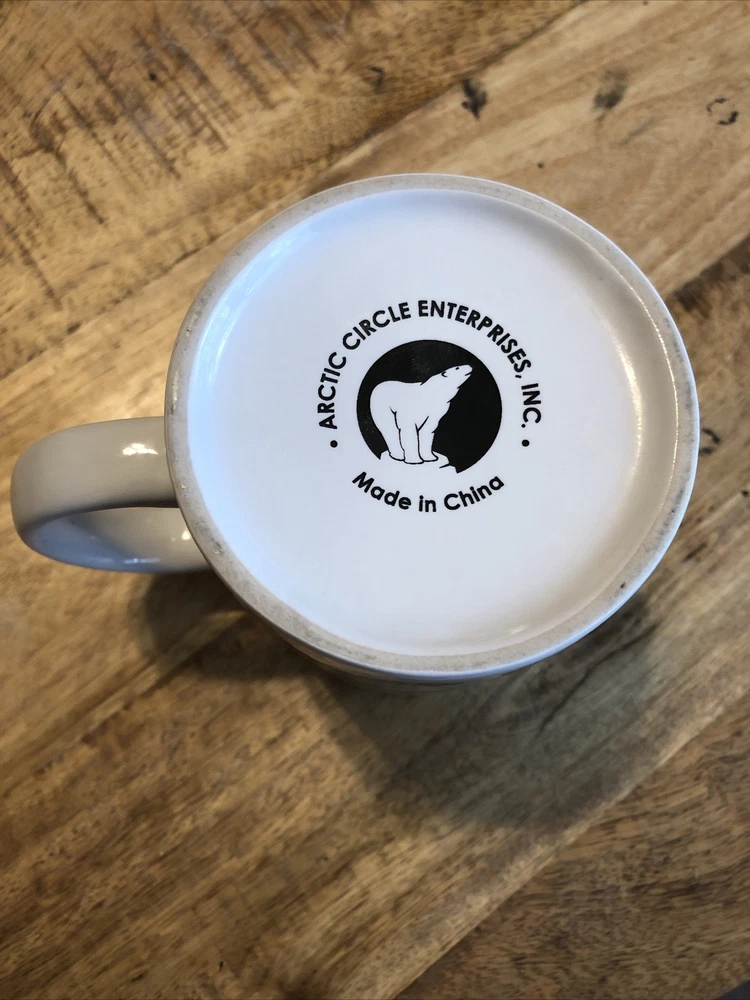 This medium-sized ceramic and porcelain mug features a round shape with a handle, suitable for hot or cold beverages. It has a capacity of 8 oz. and is designed with a multicolor pattern showcasing elements of the outdoors, fishing, wild animals, camping, and topographical themes, representing the Arctic Circle in Alaska. The mug is branded by Artic Circle Enterprises and is ideal for serving coffee, tea, or other hot beverages, making it a collectible piece for those who appreciate souvenir items.