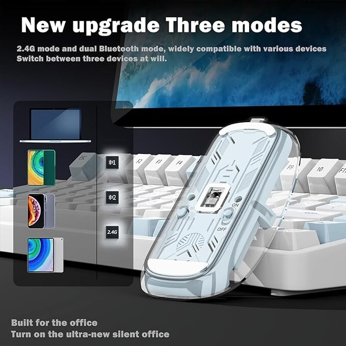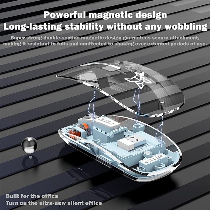 Arctic Fox Pureview Transparent Wireless & Bluetooth Rechargeable Mouse – Space Gray | USB Receiver & LED Battery Magic Slim for Office/PC/Mac/Laptop/Apple/iPad Enhance your workspace with the Arctic Fox Pureview Transparent Wireless and Bluetooth Rechargeable Mouse , designed for seamless performance and sleek aesthetics. This premium, slim, and ergonomic mouse is perfect for professionals, gamers, and tech enthusiasts who value comfort and innovation. Key Features: Wireless & Bluetooth Connectivity: Enjoy the flexibility of both wireless and Bluetooth connections, ensuring compatibility with a wide range of devices including PCs, Macs, laptops, iPads, and more. Rechargeable Design: Say goodbye to disposable batteries. This eco-friendly mouse features a built-in rechargeable battery, offering long-lasting power with a convenient USB-C charging port. Sleek Transparent Design: The modern, transparent body gives this mouse a futuristic and unique look, blending style with functionality. LED Battery Indicator: Stay informed with the LED light that indicates battery life, so you're never caught off guard by a low charge. Slim & Lightweight: Its slim profile and lightweight build make it perfect for portability, whether you're working at a desk or on the go. Wide Device Compatibility: Works seamlessly with Windows , Mac , iOS , and Android devices, including laptops, desktops, tablets, and more. Quiet & Smooth Operation: The responsive optical sensor provides precise movement and a quiet click for uninterrupted work sessions. Specifications: Color: Space Gray Connectivity: Bluetooth & 2.4GHz Wireless via USB Receiver Battery: Rechargeable with LED indicator Compatibility: Compatible with Office/PC/Mac/Laptop/Apple/iPad Dimensions: Compact and slim, perfect for portability Design: Transparent body with LED accents Perfect For: Office Professionals: Achieve productivity with a comfortable, high-performance mouse. Travelers & Remote Workers: Compact and portable for easy use anywhere. Tech Enthusiasts: The transparent design and advanced features will impress tech lovers. Elevate your computing experience with the Arctic Fox Pureview Mouse —a sleek, stylish, and practical solution for any user looking to combine form and function.