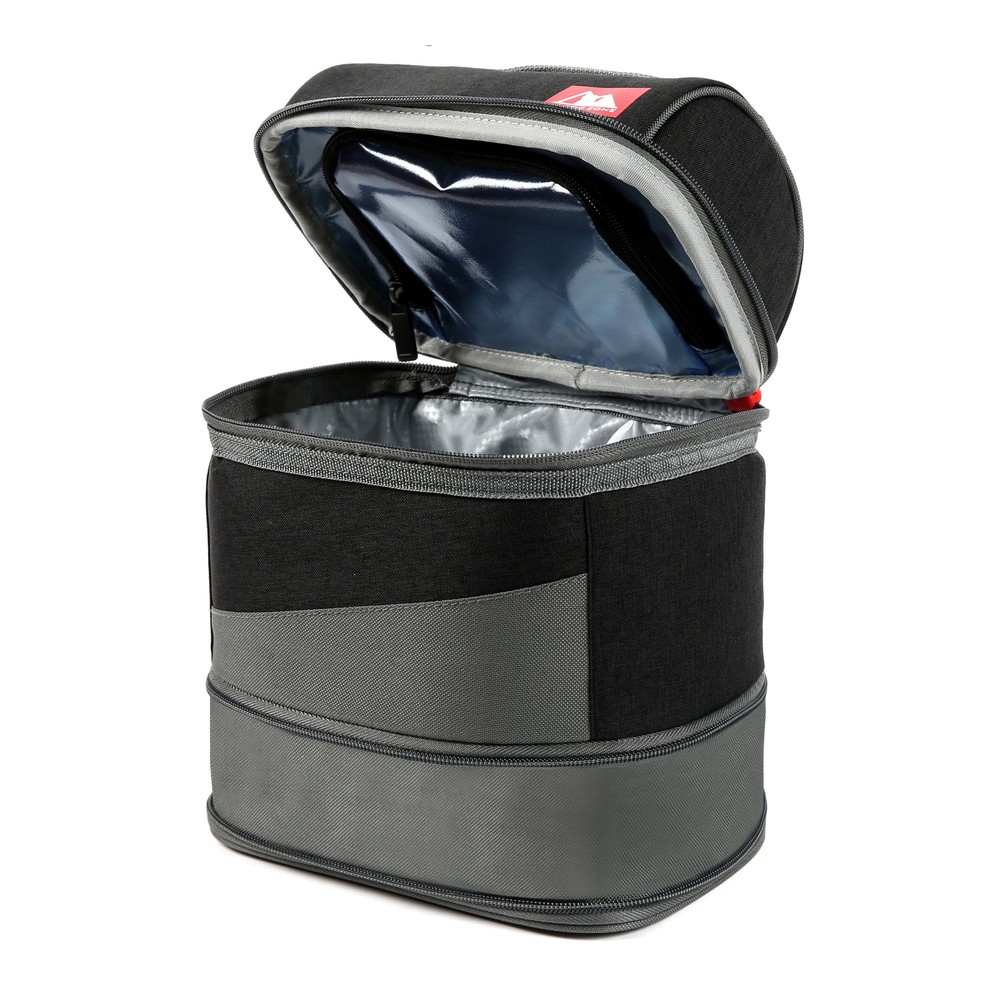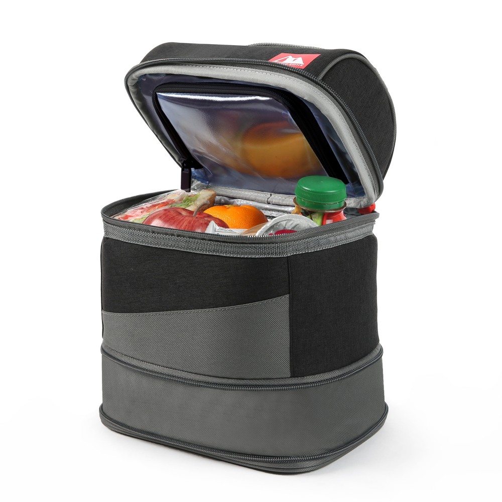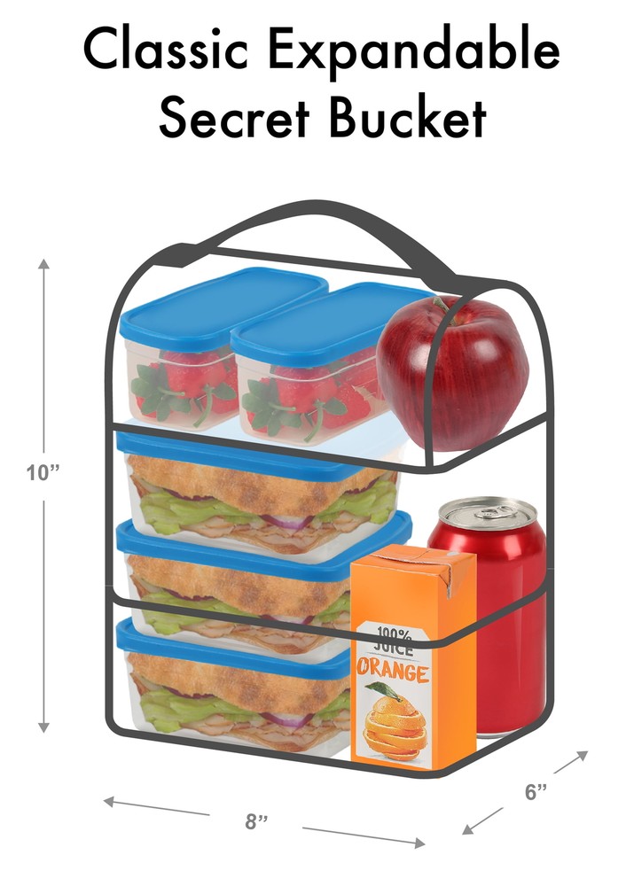 The Expandable Secret Bucket features two large compartments separated by a transparent interior divider and includes a high performance ice pack that enhances cold retention. If you want to carry taller items, just unzip the divider for more vertical space. The bucket also has an expandable bottom compartment for those days when you want to bring even more food. The interior of the bucket has high density thermal insulation to keep food and drinks cool and fresh, a leak proof bottom compartment and Ultra Safe easy clean lining with Microban to help protect against bacterial odors and stains. 2 Compartments separate drinks from food, hard from soft High density thermal insulation keeps contents cold Zippered, transparent compartment divider unzips to provide space for taller items Expandable bottom compartment for those days when you want to bring more food Leak proof bottom compartment means no more worries about food or liquids seeping out from the bottom of the pack Ultra Safe easy clean lining with Microban to help protect against bacterial odors and stains and make the lining easier to clean Carry handle High performance ice pack enhances cold retention Reusable lunch box
