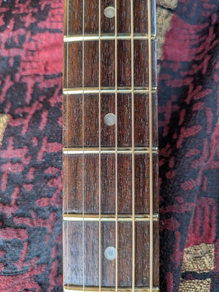 Great sounding guitar, loud with clarity, very good bass for a laminate top. An early model with a cedar top (from what it looks like and from what I read on the net). Also has V bracing instead of the typical X bracing, which I have only seen before on another early Aria orchestra model. Added Jescar gold EVO frets (harder than nichel silver) leveled crowned and polished. Slightly tapered the braces through the sound hole for more bass response. Slim neck, plays like an electric. Added a bone saddle and nut, ebony pins and filled the adjustable saddle slot with an ebony inlay. The original adjustable saddle comes with it. Added an Oak shim to increase saddle height and adjust action. Filled finish cracks with CA glue and wet sanded at least a third of the finish off to improve sound and remove most of the scratches. Looks great, plays great.