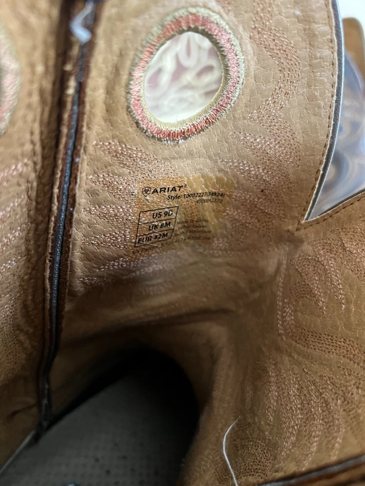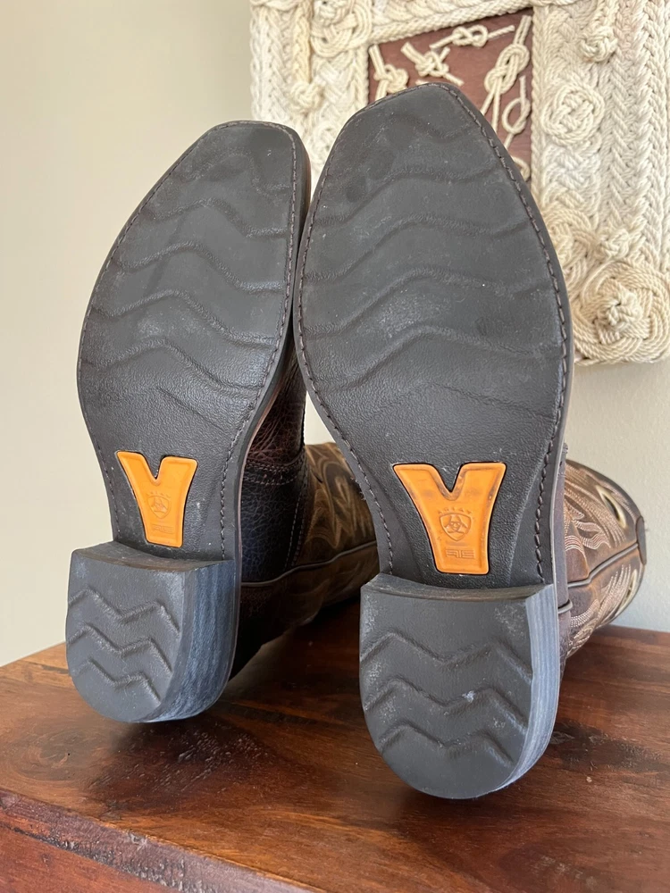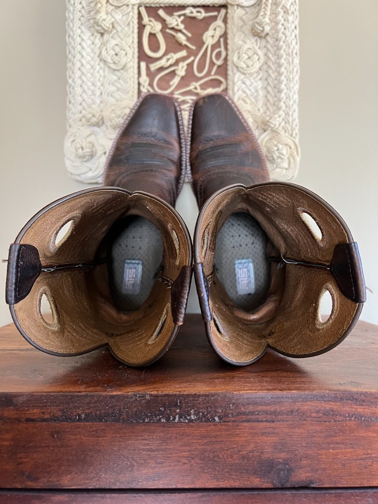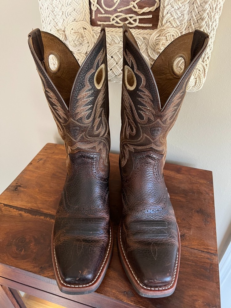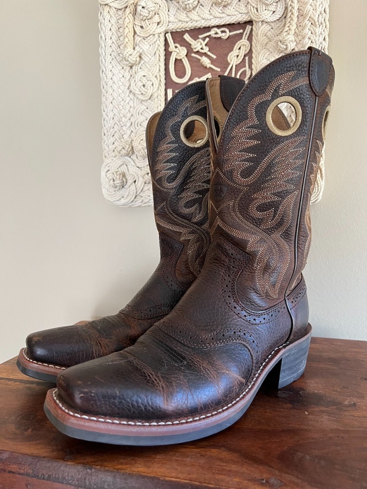 This is a really nice pair of Ariat boots called the Heritage Roughstock. They are used, but are clearly still in great condition. A handsome and tough pair of cowboy boots for sure! These are men's size 9D and I'd say they are true to size as compared to my Nocona and Luchese boots for reference. They are about 13'' tall overall, with a 2'' heel. No original box. All sales final, no returns. Thanks for looking!