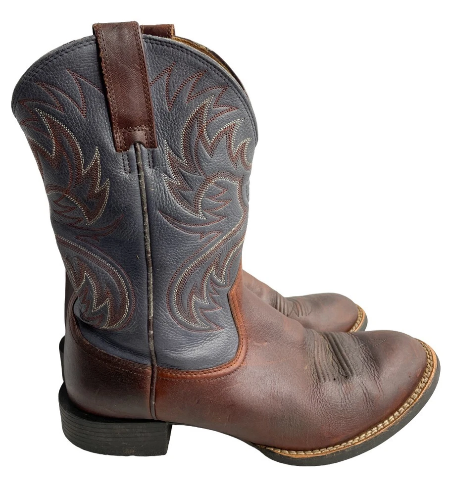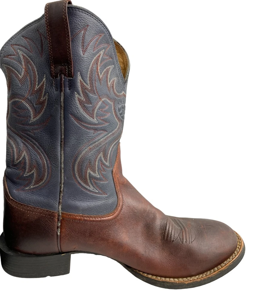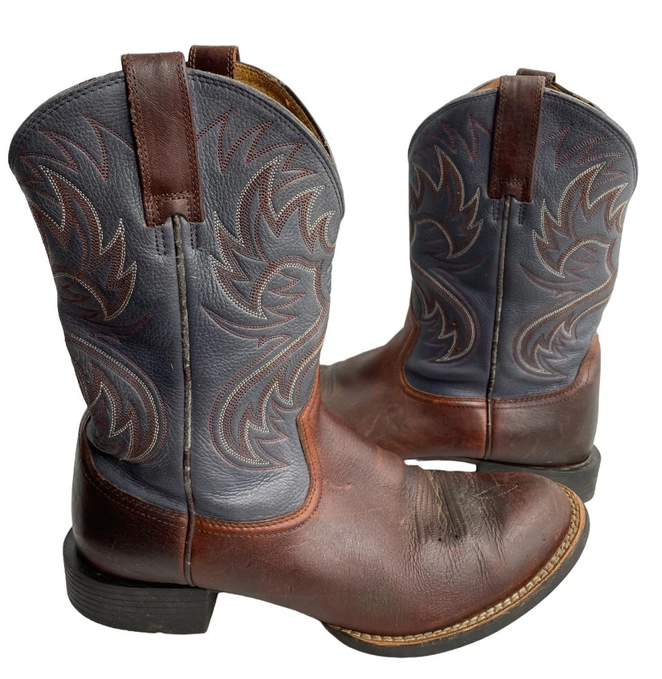 US Shoe Size: 10.5 Brand: Ariat Accents: Embroidered Color: Blue Toe Shape: Round Toe Product Line: Ariat Horseman Department: Men Pattern: Western Upper Material: Leather Model: 33972 Shoe Width: D Style: Western Closure: Pull On Theme: Cowboy Type: Boot Features: Comfort