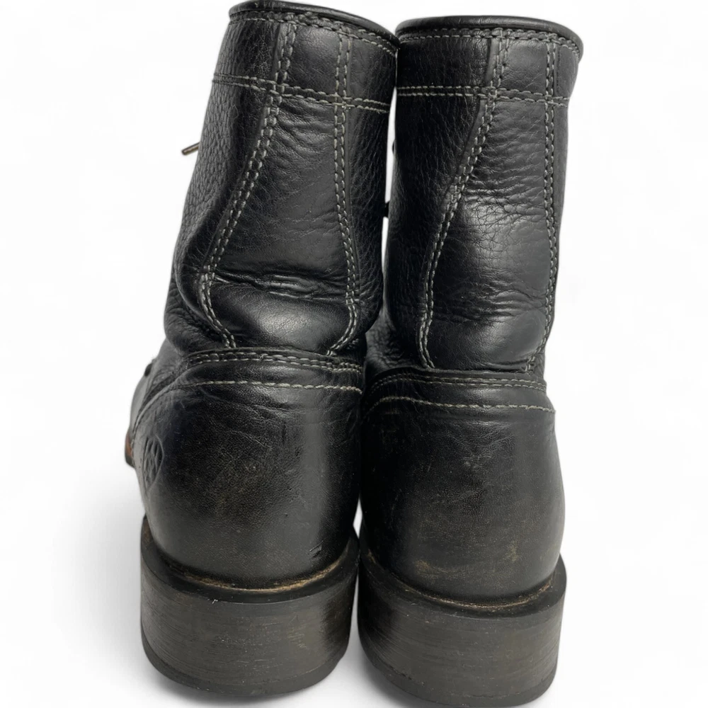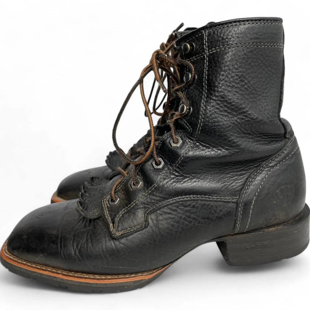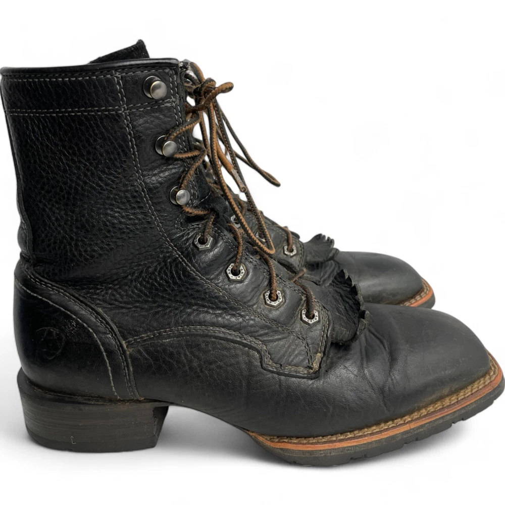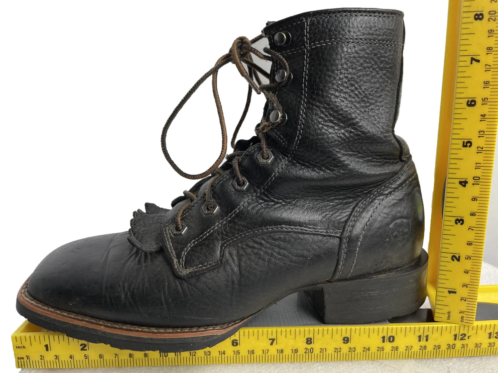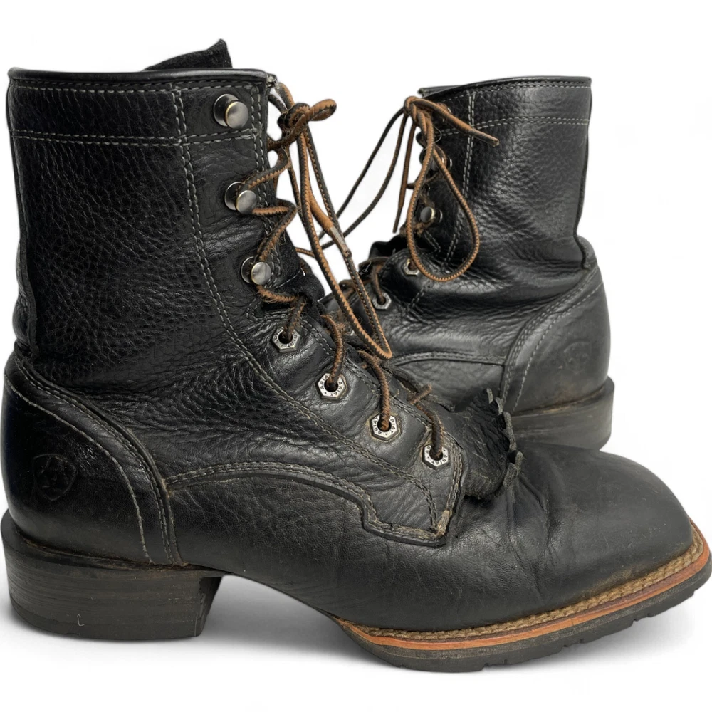 Theme: Biker, Cowboy, Western, Work Department: Men Accents: Embroidered Color: Black Pattern: Solid Brand: Ariat Features: Comfort Closure: Lace Up Product Line: Ariat Hybrid Lacer Upper Material: Leather Shoe Width: D Toe Shape: Square Toe Type: Boot Model: Ariat 10012777 US Shoe Size: 8 Style: Work