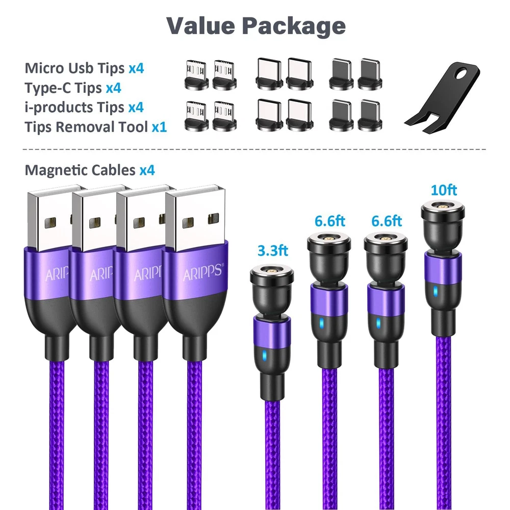 Aripps Magnetic Charging Cable 4 Pack (3.3ft/6.6ft/6.6ft/10ft), 540 Degree Rotating Magnetic Phone Charger Cable, 3 in 1 Nylon Magnetic USB Cable for Micro,Type C and iProduct Device 【Upgraded 540° Rotation & Led Light Design】 180°L shape & 360°rotating magnetic head design, It has all the functions of the straight and 90 degrees L-shaped magnetic cable.It's user-friendly design more convenient and comfortable for playing games, watching videos, reading e-books and online shopping when you charging. LED lights are designed to help you find cables more easily in the dark. 【3 in 1 Universal】Our cable equipped with 3 different types of magnetic tips(Micro,Type C,i-Products), fit most devices which is Micro USB & Type C & i-Products. You can use 1 magnetic USB cable to charge multiple interface devices. Reminder: [The USB C charger cable only Supports ordinary charging, Not for fast charging, Not for data transfer, Not compatible with Car Play and Android Auto! The Max output is 5V/2.4A. There is no C attachment.] 【Strong Magnetism & One Hand Operation】 Cable come with super strong magnetic,which can automatically absorb magnet charging cable quickly at a right direction and not easy to fall off. Easier and safer to charge your phone with one hand when you're driving. 【High-Quality Nylon Braid】With 10,000+ times bend test, the flexible and durable double-braided nylon magnetic charging cable longer service life and will never bended and rupture, more durable than standard phone charger cord. 【Super Value Package】540° Rotation Magnetic charging cable* 4; magnetic micro tips *4, magnetic Type-C tips *4, magnetic i-product tips *4, cable ties* 3, magnetic tips removal tool*1. Ensure your 100% safety equipment, each sale includes a 12-month worry-free warranty and lifetime after-sales service to prove our commitment to quality. 【Upgraded 540° Rotation & Led Light Design】 180°L shape & 360°rotating magnetic head design, It has all the functions of the straight and 90 degrees L-shaped magnetic cable.It's user-friendly design more convenient and comfortable for playing games, watching videos, reading e-books and online shopping when you charging. LED lights are designed to help you find cables more easily in the dark. 【3 in 1 Universal】Our cable equipped with 3 different types of magnetic tips(Micro,Type C,i-Products), fit most devices which is Micro USB & Type C & i-Products. You can use 1 magnetic USB cable to charge multiple interface devices. Reminder: [The USB C charger cable only Supports ordinary charging, Not for fast charging, Not for data transfer, Not compatible with Car Play and Android Auto! The Max output is 5V/2.4A. There is no C attachment.] 【Strong Magnetism & One Hand Operation】 Cable come with super strong magnetic,which can automatically absorb magnet charging cable quickly at a right direction and not easy to fall off. Easier and safer to charge your phone with one hand when you're driving. 【High-Quality Nylon Braid】With 10,000+ times bend test, the flexible and durable double-braided nylon magnetic charging cable longer service life and will never bended and rupture, more durable than standard phone charger cord. 【Super Value Package】540° Rotation Magnetic charging cable* 4; magnetic micro tips *4, magnetic Type-C tips *4, magnetic i-product tips *4, cable ties* 3, magnetic tips removal tool*1. Ensure your 100% safety equipment, each sale includes a 12-month worry-free warranty and lifetime after-sales service to prove our commitment to quality. Shipping from the USA All of our products are shipped from the USA, ensuring quick delivery to your destination. Payment We offer the following payment methods: PayPal, credit card, bank transfer, and eBay's secure payment system. Free Shipping & Free Returns Shipping within the USA is FREE. Additionally, any return is absolutely free for you. Risk-Free Purchase You have the option to return an item within 30 days without any justification. We cover the return shipping costs! Fast Shipping We ship immediately upon receipt of payment. Generally, the package is delivered within 2-3 days in the USA. If it takes longer, we will contact you. Quality and Costs Made in Europe, USA, China No customs fees or additional charges Total satisfaction guarantee Invoice with declared VAT available upon request in .pdf format Feedback Your feedback is very important to us. After you pay for your purchase, you will automatically receive positive feedback from us.