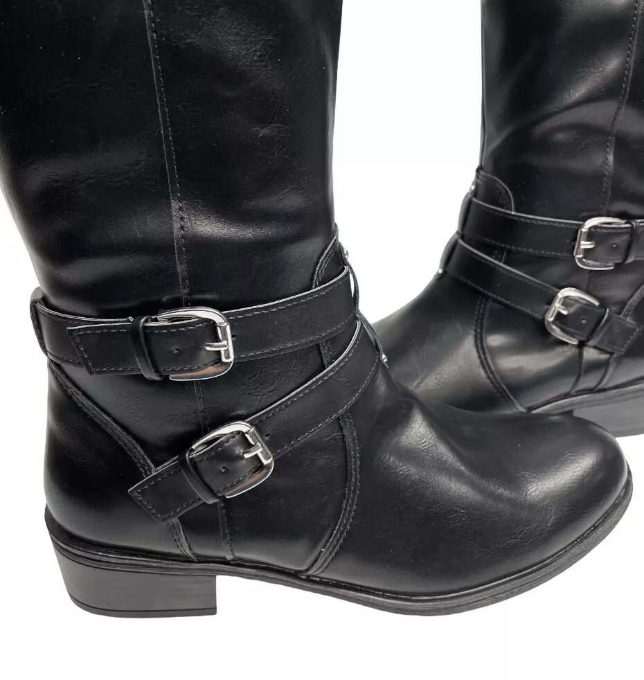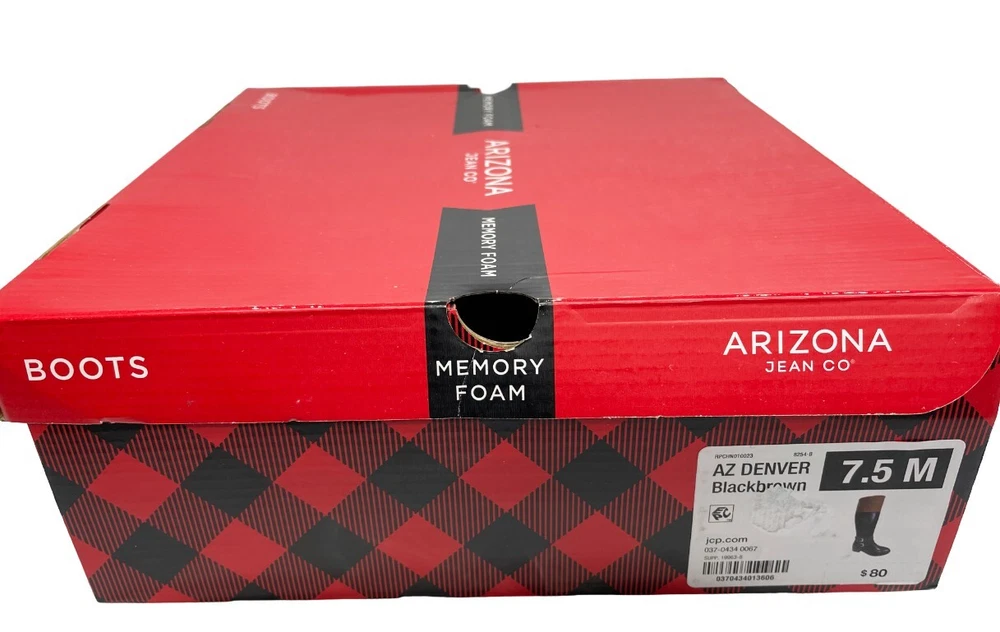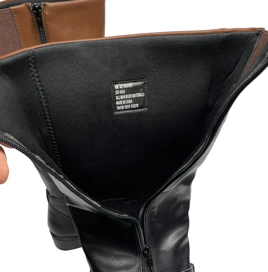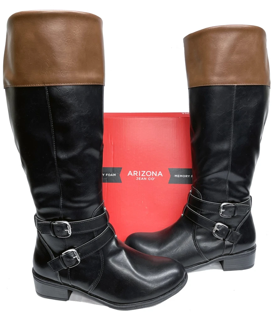 Character: Boots Accents: Buckle Heel Style: Block US Shoe Size: 7.5 Closure: Zip Shoe Shaft Style: Knee High Type: Boot Occasion: Business, Casual, Party/Cocktail, Travel, Workwear Heel Height: Mid (2-2.9 in) Model: Denver Department: Women Shoe Width: M Toe Shape: Round Toe Features: Comfort, Lightweight, Memory Foam Pattern: Solid Style: Riding Boot Upper Material: Faux Leather Theme: American, Equestrian, Modern Brand: Arizona Jean Co Color: Black brown