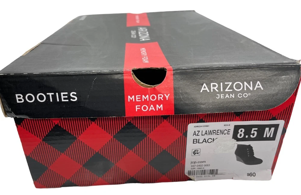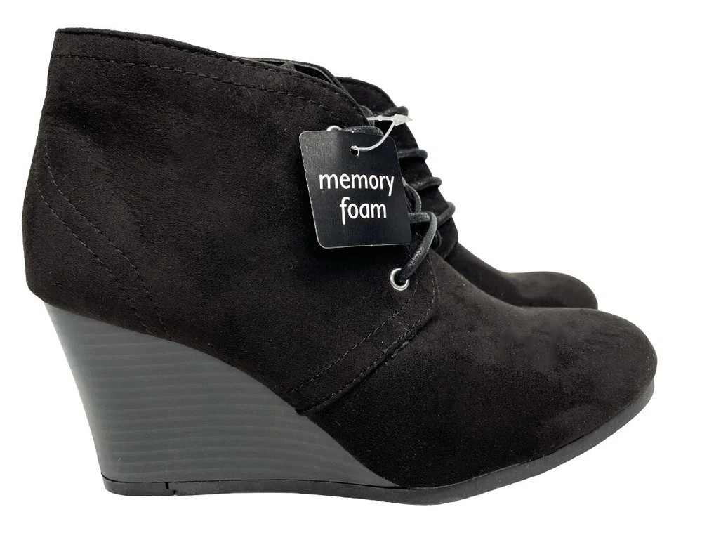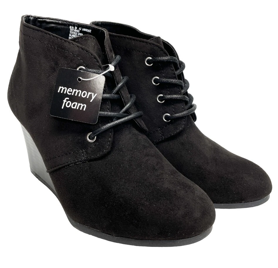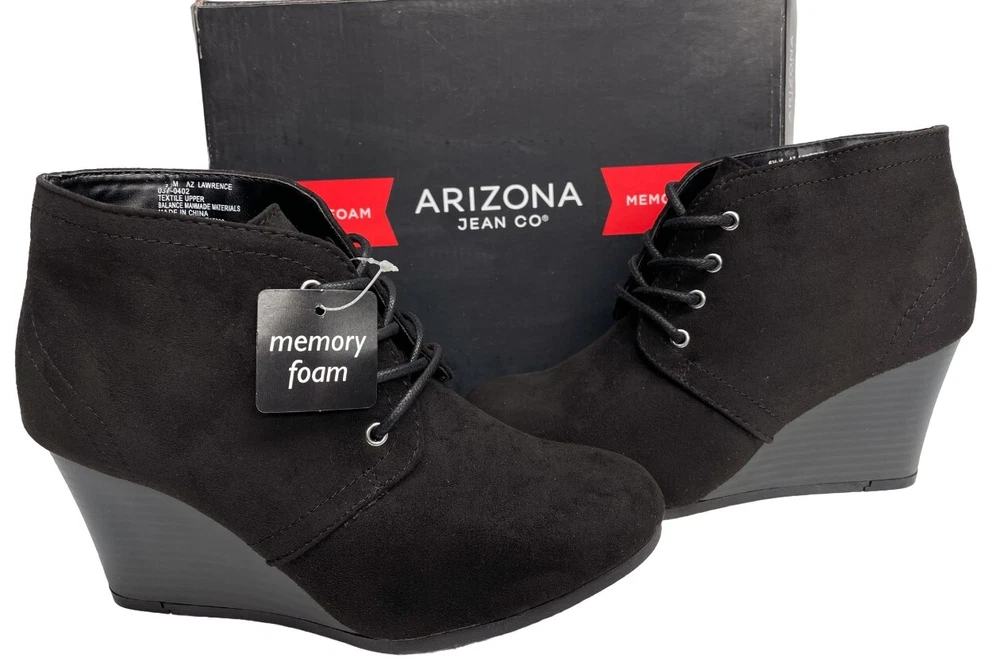 Theme: American, Modern Toe Shape: Round Toe Pattern: Solid Brand: Arizona Jean Co US Shoe Size: 8.5 Model: Lawrence Closure: Lace Up Type: Boot Style: Bootie Character: Boots Features: Comfort, Lightweight, Memory Foam Upper Material: Faux Leather Shoe Shaft Style: Ankle Heel Height: High (3-3.9 in) Color: Black Heel Style: Wedge Shoe Width: M Department: Women Occasion: Business, Casual, Party/Cocktail, Travel, Workwear