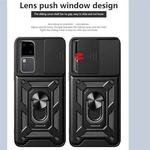 Return Policy Fast Delivery Trusted seller Armor Case for Vivo V30 /V30 Pro with Sliding Camera Cover, Military Grade Heavy Duty Shockproof Protective Phone Case with Kickstand for Vivo V30 /V30 Pro SJ Black Product Description 【Model】Phone case compatible with Vivo V30 /Vivo V30 Pro. 【Lens Slide Cover】The innovative lens slide cover feature of this product allows for seamless cover opening and closing. With a smooth slide motion, the lens cover easily reveals the camera lens, ensuring quick access and enhanced user convenience. 【Rotating Stand】The built-in rotating stand enables versatile positioning options, making it ideal for capturing videos or enjoying multimedia content. It provides flexible viewing angles, allowing users to adjust the device to their preferred orientation for an enhanced multimedia experience. 【Sturdy and Durable】This product has undergone rigorous drop tests to ensure durability and withstands accidental drops and impacts. Its robust construction and reliable build quality make it a suitable choice for long-term use. 【Car Mount】This product features a built-in metal plate that makes it compatible with car mounts. The integrated metal plate ensures a secure grip when attached to magnetic car mounts, providing a stable and hands-free experience while driving. Shipping Returns Payment Shipping Shipping is FREE to all addresses other than APO/PO boxes in the lower 48 states. All our stock ships from US-based warehouses. Shipped via USPS or UPS (depending on location and package weight) Unless stated otherwise, all orders will ship within 24-72 hours of your payment being processed. Check our feedback to see the great reviews of FAST shipping we offer. Returns Seller does not accept returns Payment We currently accept payment via eBay managed payments only. Once payment is cleared, we will dispatch your shipment within 1-3 business days. Please refer to the "Shipping" tab for more information regarding shipping speed to your destination.