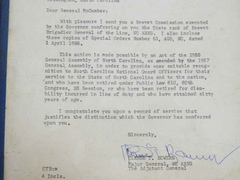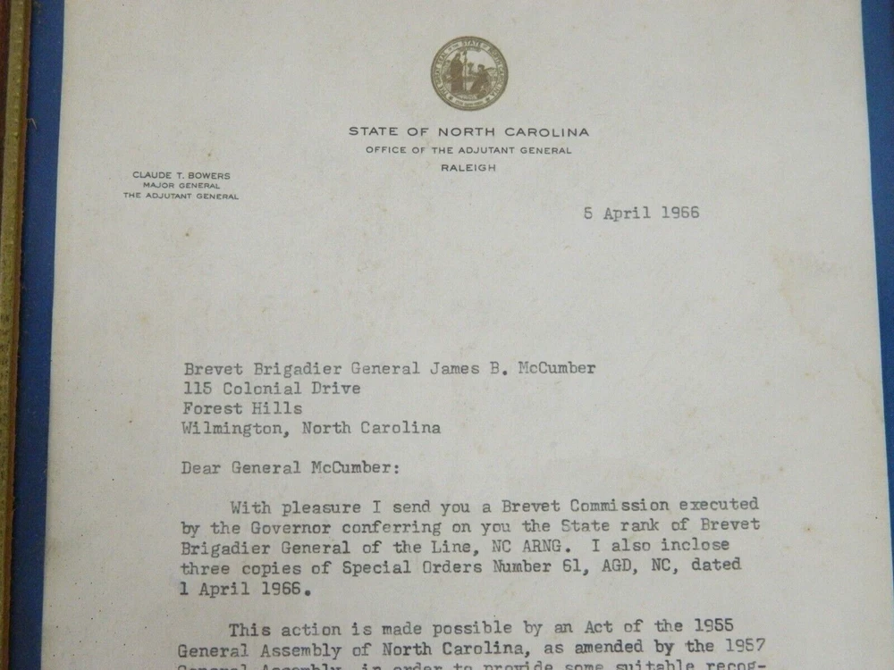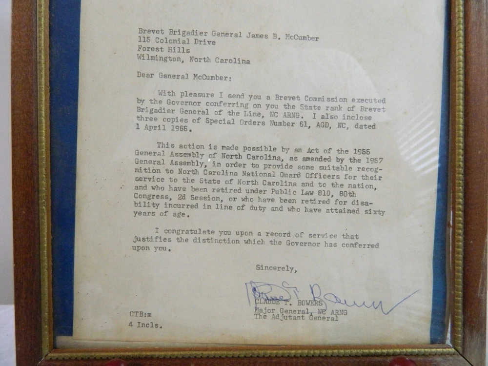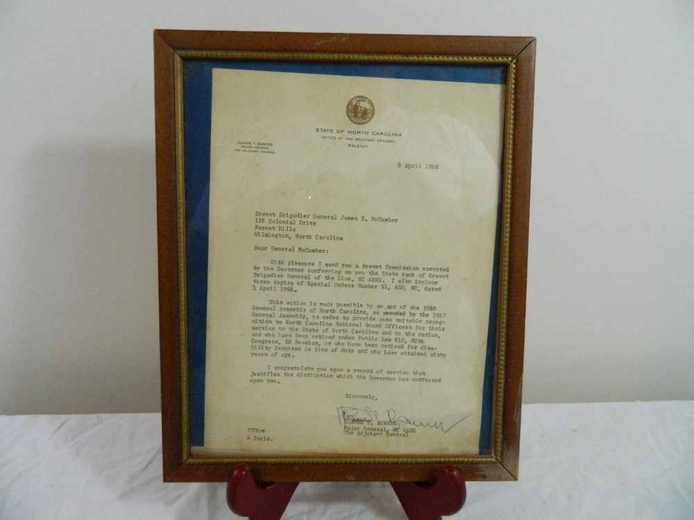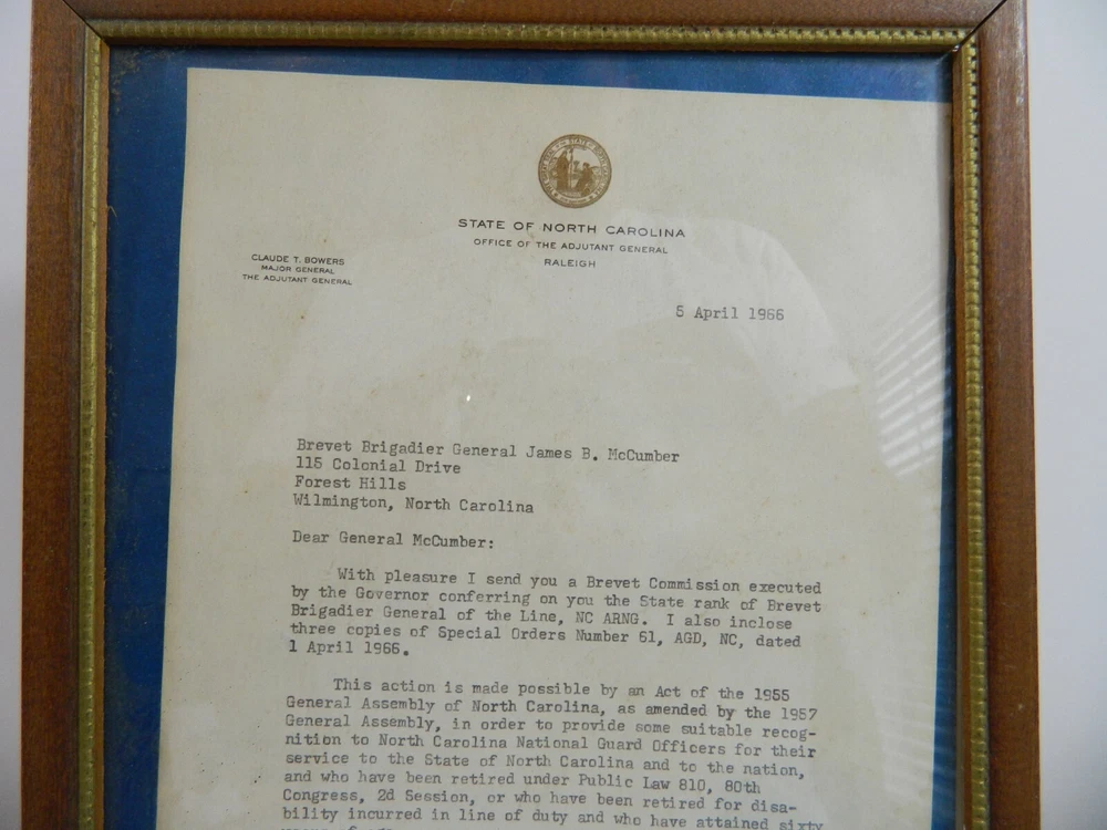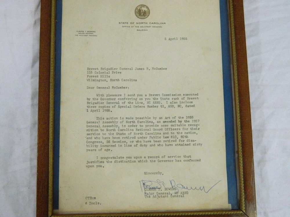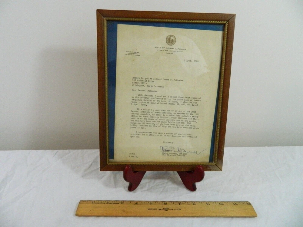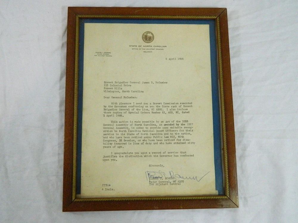 This is for a April 5, 1966 State of North Carolina Brevet Brigadier General James B. McCumber , Brevet Commission Executed by North Carolina Governor. It is a framed paper certificate, it was not removed from the frame. It is in good used collectible condition. The certificate is a little yellowed. It has some mild stains. The frame measures approx. 11" x 9" x 3/8". JBMBrevet