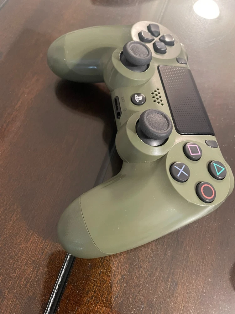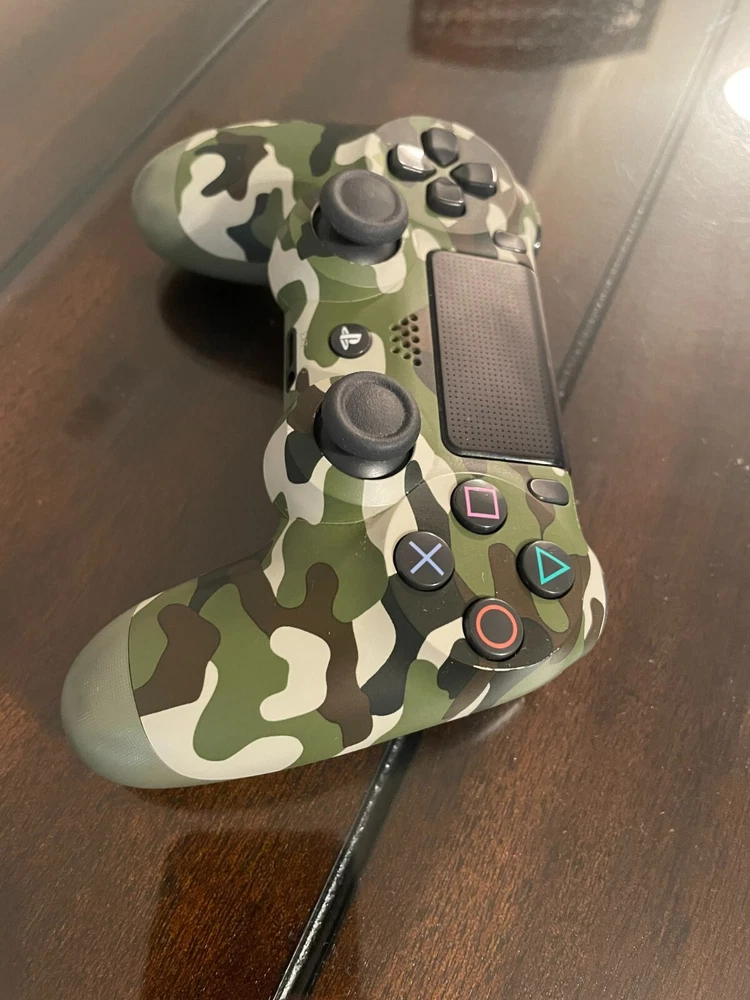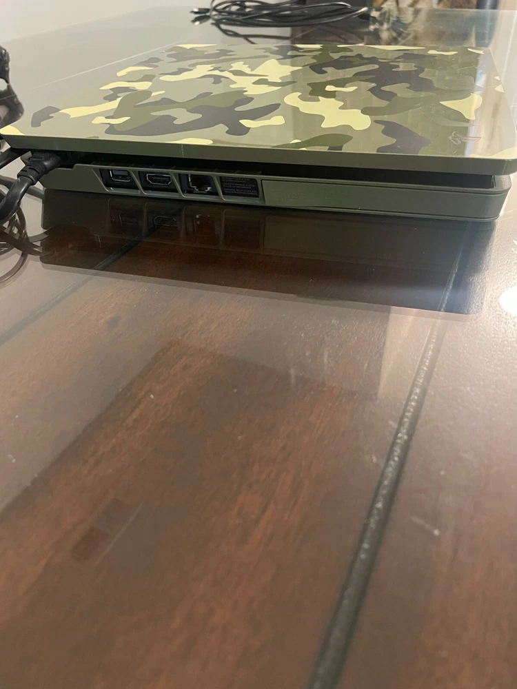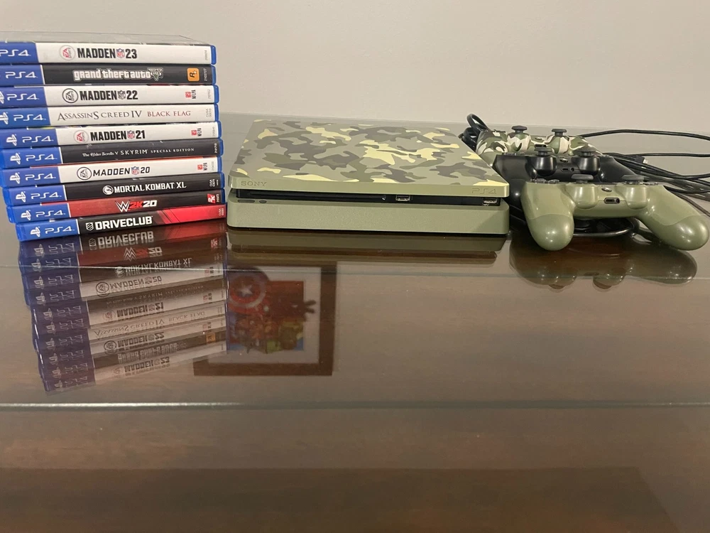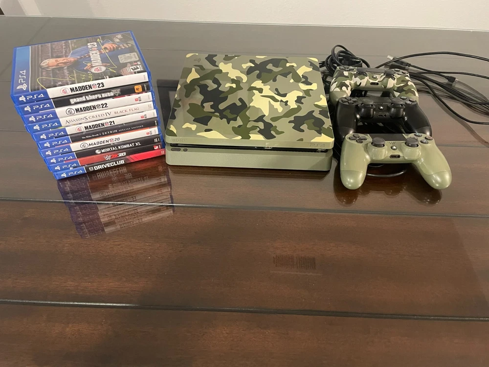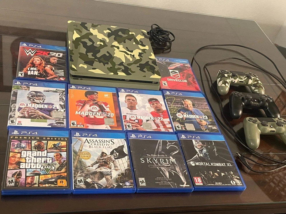 Super Great Buy for the holidays! Army Fatigue colored console with three controllers and 10 PS4 games. Games include: Madden 23, 22, 21, 20, Grand Theft Auto 5, Assassins Creed 4, Skyrim, Mortal Kombat XL, W2K20, and Drive Club. Game console works. Scratches on top surface of console, small crack at ps4 right side port, and back panel slightly loose on back side of console.