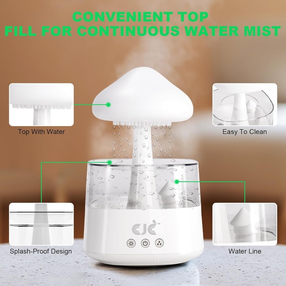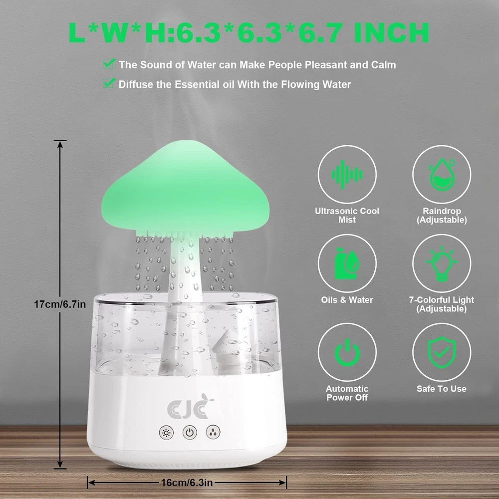 Product Description Humidifiers for Bedroom, 7 Color-Changing Led Night Lights, Aromatherapy Essential Oil Diffusers, Bedside Mushroom Water Drip Cloud Diffuser Adjustable-Auto-Shut Off (White Cloud, CH08) 【2 IN 1 Humidifier and Essential Oil Diffuser】Elevate your relaxation with our humidifier's soothing 7-color LED lights. Watch as the hues gently shift, creating a mesmerizing ambience that complements any room's décor. Perfect for setting the mood during aromatherapy sessions or winding down after a long day. The soft pitter-patter of the simulated rain-drops creates a calming atmosphere, making it perfect for use in bedrooms, nurseries, or meditation rooms 【Powerful Mist Output】Immerse yourself in a cloud-like mist with our upgraded Ultrasonic Humidifier by CJC. It spreads a refreshing mist covering a wider area, delivering up to 50ml/h, boosting humidity by 10% in just 10 minutes. Ease congestion, coughing, allergies, and dry skin with efficient humidity control 【Extended 8-Hour Runtime】Enjoy customizable mist intensity with three levels of output. Its water tank allows for up to 5-8 hours(1 Night) of continuous operation on the lowest setting, reducing frequent refills. The auto-shutoff feature ensures safety by turning off when water levels are low or the tank is removed.Please be careful not to add water beyond the water line.Can be used for 15 days with full water 【Smart Humidity Control】With its built-in humidity sensor, the humidifier detects room humidity levels and adjusts mist output according to your preset comfort level. Maintain indoor comfort within the recommended 45% to 55% humidity range for optimal well-being. Set your desired humidity level and let the smart humidifier handle the rest 【Instructions】The humidifiers has a total of 3 function keys:①The light key can adjust 7 colors and can be fixed in monochrome mode or adjusted to 7-color switching mode.②The switch key controls on and off and can also be used for timing. Press and hold for 3 seconds to set the timer, it will automatically turn off after 5 hours. ③The rain button controls the 3 modes effect of rain. Long press the rain button to control the opening and closing of the atomization effect About Us We are a reputable seller with many years of experience selling on eBay. Our goal is to provide high-quality products and excellent customer service. Shipping Items will be shipped within 1-3 business days when we received payment. (Orders are not processed on weekends & holidays) Tracking information will be sent once item is shipped. Delivery time depends on destination and other factors Item is shipped to ebay address. Leaving correct address can minimize delay. For international shipping and shipping to Guam, Hawaii and Alaska, Please contact us before placing the order. International buyers please note: Import duties, taxes and charges are not included in the item price or shipping charges. These charges are buyer’s responsibility. We will try our best to reduce the risk of the custom duties. Local pick-up is unavailable at the moment. Contact Us We reply any email messages within 1 business / working days(off-duty at weekend). If you do not get a response from us, then please check your junk or spam mailbox. Our Business hours: Mon-Fri 9:00-18:00, UTC/GMT +8 hours. Please contact us either by clicking "contact seller" in the "purchase history" section or simply click "ask a question" at the bottom of this page. If you are unsatisfied with our item or service, please contact us before leaving any feedback. We are committed to resolve all issues in a friendly and satisfactory manner.