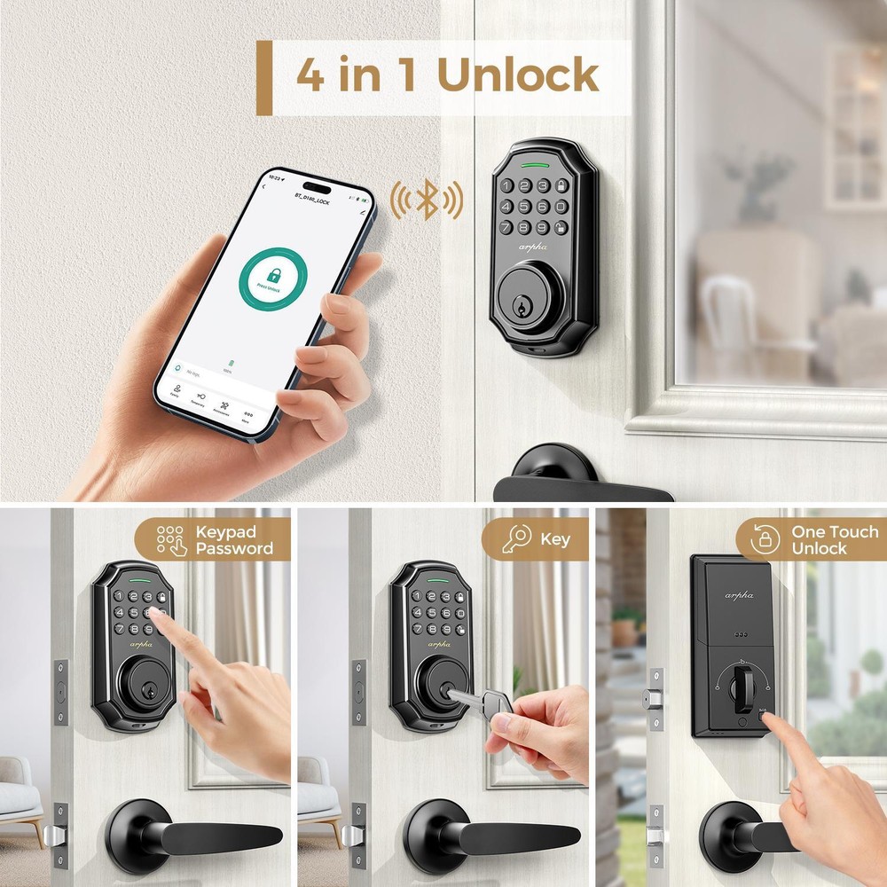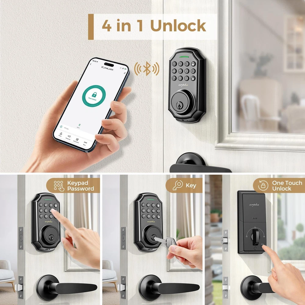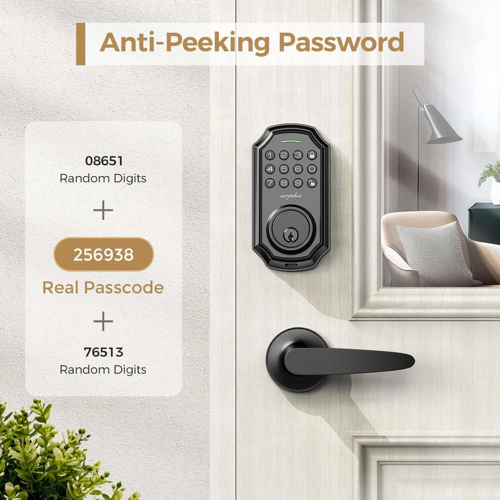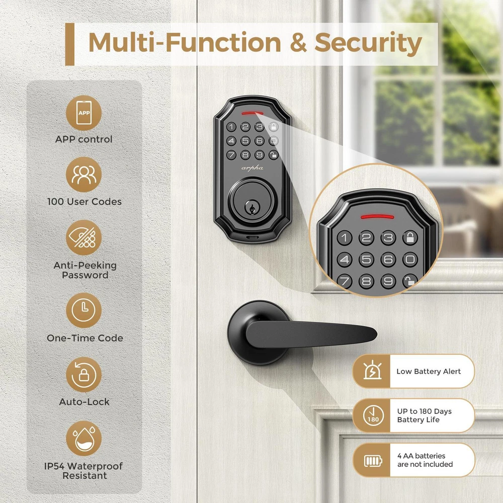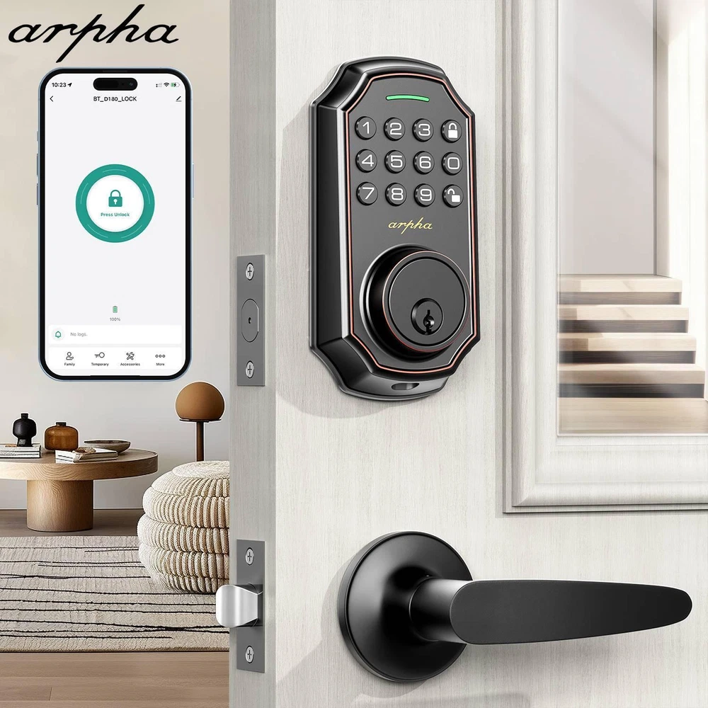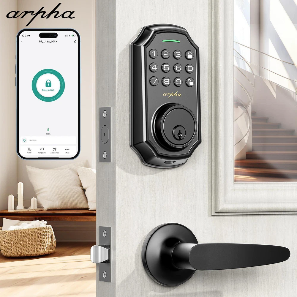 Description Report Item / Suspicious Activity Arpha Smart Lock D180H Keyless Entry Door Lock with 2 Handle Set Electronic Keypad with App Control 100 Code Keypad with Handle ๐๐๐ฒ๐ฅ๐๐ฌ๐ฌ ๐๐ง๐ญ๐ซ๐ฒ ๐๐จ๐จ๐ซ ๐๐จ๐๐ค Arpha keypad door lock could be unlocked via App + Password + EKey + Mechanical key. Smart deadbolt supports 100 groups of access codes for the front door, including 97 users and 3 admin passcodes. Everything you need in 1 safe and secure smart lock. ๐๐ฎ๐ญ๐จ ๐๐จ๐๐ค & ๐๐ง๐ ๐๐จ๐ฎ๐๐ก ๐๐จ๐๐ค Electronic door lock is designed with a smart one-touch switch. Keypad door lock offers one-touch lock feature to control the door easily. You can enable the auto-lock feature and set the timer from 10s-30min! Now you don't need to worry about forgetting to lock the door. ๐๐ฉ๐ฉ ๐๐จ๐ง๐ญ๐ซ๐จ๐ฅ You could generate and share one-time, permanent, scheduled, and recurring code with your family, house sitters and guests. Manage users, and view access records in the app management system. The App is no additional charge and can be used forever.App remote unlocking requires the use of a gateway ASIN: B09YHFG933 ๐๐ง๐ญ๐ข ๐๐๐๐ฉ๐ข๐ง๐ ๐๐๐ฌ๐ฌ๐ฐ๐จ๐ซ๐ Keyless entry Door Lock security lock supports 16-digit virtual password unlocking method. Users could unlock by entering 10 to 8 digits before or after setting a 6 to 8 digit password. Add random numbers before or after your correct passcode to protect it from prying eyes. Long Battery Life LONG BATTERY LIFE: Powered by 4 AA batteries, it can last for about 180 days, reducing the hassle of frequent battery replacement. (Note: Batteries are not included in the package) ๐๐๐ฌ๐ฒ ๐ญ๐จ ๐๐ซ๐จ๐ ๐ซ๐๐ฆ๐ฆ๐ ๐๐ง๐ ๐๐ง๐ฌ๐ญ๐๐ฅ๐ฅ Arpha front door lock set fits for most US standard left and right hand doors. You can easily install it in a few minutes without drilling. Excellent Service Guarantee๏ผ Our dedicated support team is available 24/7 after-sales email service to assist you.Arpha offers a 30-day money-back and 18 month assurance and lifetime technical support. Please do not hesitate to tell us if you need our help. class="extend--iframe--to7hHIV" data-spm-anchor-id="a2g0o.detail.0.i3.3204gYWpgYWprU" data-spm-act-id="a2g0o.detail.0.i3.3204gYWpgYWprU" style="box-sizing: border-box; -webkit-tap-highlight-color: transparent; outline: 0px; margin: 0px; padding: 0px; height: 1200px; position: absolute; top: 0px; visibility: hidden; width: 1000.5px; z-index: -1;"> View more