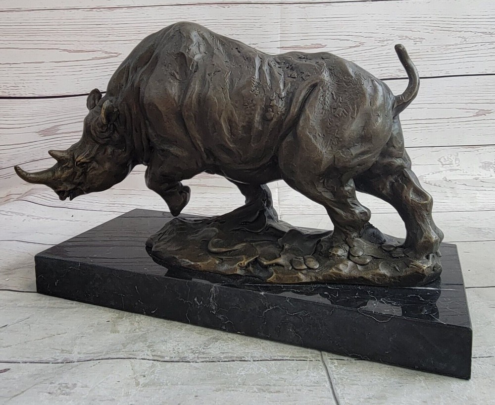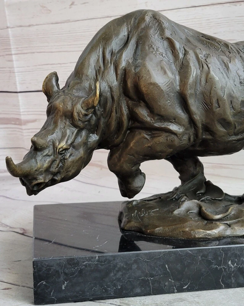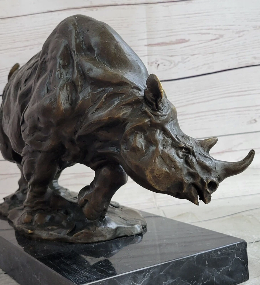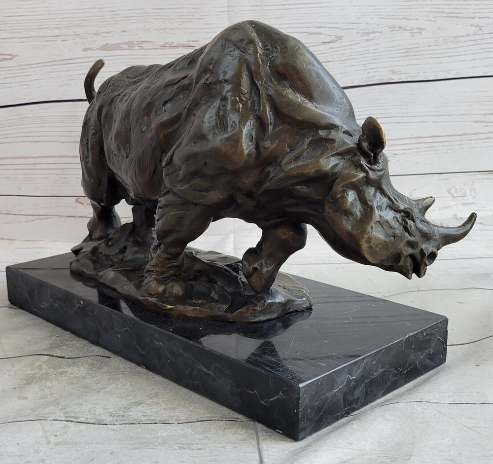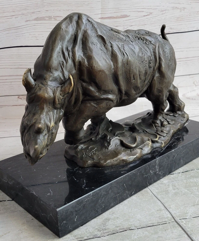 Condition : This sculpture is in perfect condition. Bronze Dimensions with Marble Base: Height 9" X Width 13" Marble Dimensions:12" X 6" Height without base:8" Weight:17 LBS Inventory:85AL3389058 Introducing a captivating bronze sculpture that celebrates the timeless and majestic rhinoceros. With a history spanning millions of years, these remarkable creatures have retained their fascinating and primitive appearance, evoking a sense of awe and wonder. This exquisite sculpture showcases the incredible craftsmanship that brings out the unique features of the rhinoceros. The artist's attention to detail is evident in the depiction of the rhino's thick skin and the intricate ridges that form as it shifts in movement. Every contour and texture has been meticulously crafted to capture the essence of this magnificent creature. The focal point of the sculpture is the rhino's head, which gently nudges the surface of a rock. The positioning allows its iconic horn to touch the ground, symbolizing its connection to the earth and emphasizing its strength and presence. The rhino's powerful stance conveys a sense of confidence and stability. The sculpture is elegantly presented on a black marble base, mirroring the shape of the rock underneath the rhinoceros. This thoughtful design choice adds to the visual appeal and complements the overall composition. The sturdy base ensures stability and enhances the overall aesthetic of the artwork. Crafted using the time-honored "Lost Wax Method," this sculpture is a testament to the artist's dedication to preserving the finest details. Each piece is individually cast and finished, ensuring the highest quality and authenticity. This remarkable sculpture bears the signature of the renowned artist Milo, reflecting his exceptional skill and artistic vision. With his signature, you can be confident in the authenticity and value of this collectible artwork. Display this captivating bronze sculpture in your home, office, or art collection, and let it serve as a reminder of the rhinoceros's enduring presence on our planet and the importance of conservation. This piece by Milo is a true testament to the beauty and magnificence of these ancient creatures. Signed Original Milo White Rhino Bronze Sculpture Marble Base Figurine Home Gift Video will open in a new window Using the eBay App? Paste link into a browser window: [isdntekvideo]