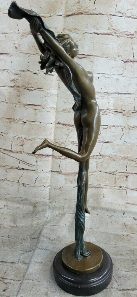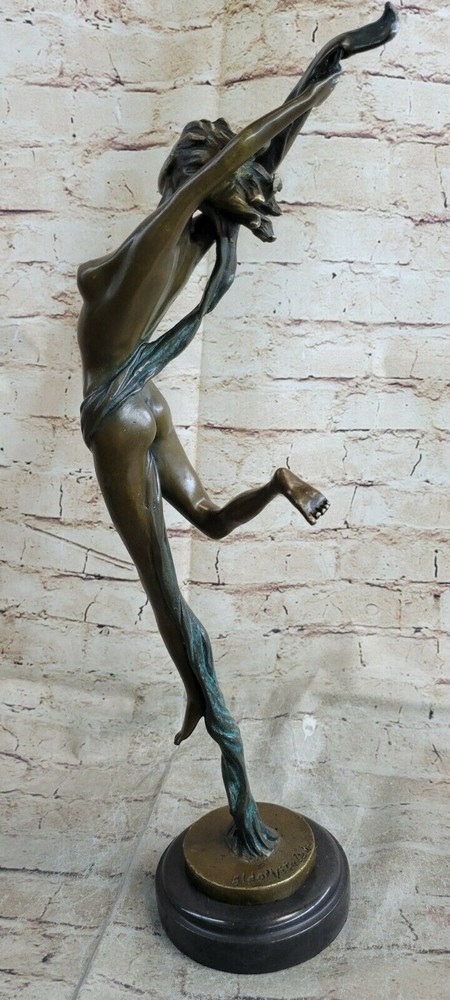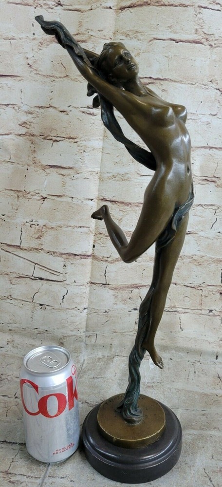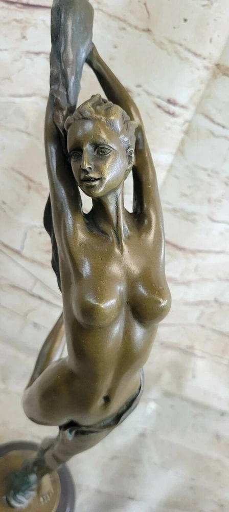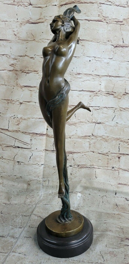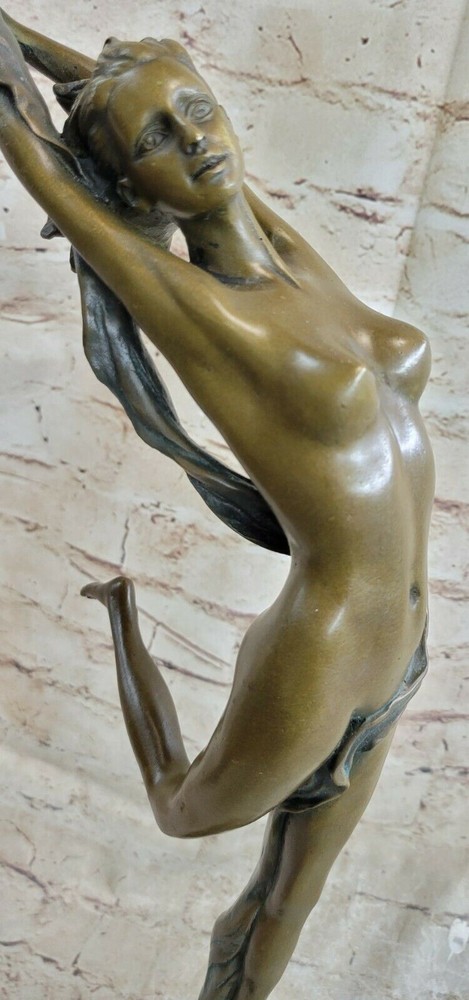 Condition :nbsp; This sculpture is in perfect condition. Bronze Dimensions with Marble Base: Height 18 1/2" X Width11" Marble Dimensions: Diameter 4 1/2" Height without base:17 1/2" Weight:9 LBS Inventory:63Y0323836 In a mesmerizing display of grace and agility, the nude aerialist leaps into the air, her body entwined with a vibrant green patina-coated fabric banner. The sculpture exudes a profound celebration of the female form, accentuating the beauty of the human physique in motion. Evoking a sense of fluidity and dynamism, the artwork captures the intricate details of the figure's movements, portraying a captivating blend of strength and elegance that resonates with the viewer. Embodying the very essence of vitality and exuberance, the sculpture reflects a deep-seated spirit that transcends physical boundaries, symbolizing the boundless yearning to connect with the world at large. Its portrayal of the human body under the influence of movement encapsulates a profound appreciation for the unrestricted potential of the human form, highlighting the innate desire to reach beyond limitations and embrace the freedom of expression and existence. Using the time-honored technique of lost wax casting, the artist has meticulously crafted the sculpture, infusing it with a rich brown patina finish that beautifully enhances the natural tones of the figure's skin. Poised on a sleek black marble base and adorned with the distinctive signature of Aldo Vitaleh, this extraordinary piece embodies the seamless fusion of artistic expression and the timeless elegance of the human spirit, serving as a testament to the enduring beauty and vitality inherent in the art of sculpture. Original Aldo Vitaleh Nude Girl Leaping In Air Bronze Statue Figurine Decor ART Video will open in a new window Using the eBay App? Paste link into a browser window: [isdntekvideo]