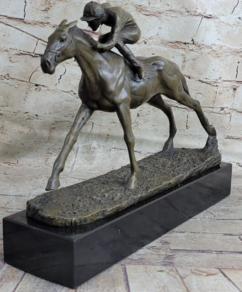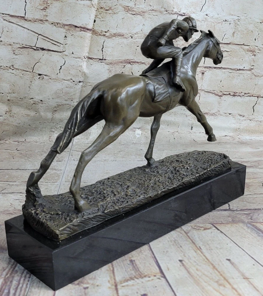 Art Deco Hot Cast Male Jockey and Horse Bronze Trophy Sculpture Figurine Artwork Art Deco Hot Cast Male Jockey and Horse Bronze Trophy Sculpture Figurine Artwork Condition : This sculpture is in a perfect condition. Bronze Dimensions with Marble Base: Height 9"" X Width 11.5" Marble Dimensions:11 1/2" X 4" Height without base:8" Weight:12 LBS Inventory:53Y3764535 Gear up for a thrilling ride like no other with this captivating bronze sculpture! A true masterpiece of motion, this dynamic piece captures the heart-pounding intensity of a high-stakes race. At its center, a steadfast thoroughbred and its skilled jockey surge forward with unparalleled determination, a partnership bound for victory. Every sinew of the horse's powerful frame ripples with energy as it charges down the grassy track, its tail billowing like a flag in the wind. The jockey, an embodiment of unwavering resolve, urges the horse on with fervent encouragement, heels dug firmly into the stirrups. Their unwavering focus is fixed solely on the finish line that beckons in the distance. Meticulously crafted using the revered lost wax method, this sculpture is a testament to the artistry and skill that goes into each and every detail. The horse's musculature is exquisitely defined, a tribute to the athleticism and grace of these majestic creatures. As the wind whips through their hair, the scene comes alive with a sense of motion and vitality that is truly mesmerizing. Whether displayed in a grand gallery or as a focal point in a cherished space, this action-packed piece commands attention and ignites a sense of awe. For those who cherish the spirit of competition and the thrill of the racetrack, this sculpture is the ultimate embodiment of ambition and dedication. An ideal gift for equestrian enthusiasts or anyone who resonates with the pursuit of excellence, it bears the distinguished signature of Milo—an assurance of artistic authenticity and a symbol of the passion that drives both horse and rider to reach for the stars. JOCKEY RIDING HORSE BRONZE STATUE FIGURE FIGURIN HOT CAST MARBLE BASE SCULPTURE www.bronzhaus.com Video will open in a new window Using the eBay App? Paste link into a browser window: [isdntekvideo] Shipping Terms : Most of our items are shipped via USPS (United States Postal Service) mail or UPS. Most orders are shipped within 24-48 hours of purchase. Please be aware that not all items are available for USPS shipping due to size and weight. We do ship to Hawaii, Alaska, Canada, Puerto Rico, APO/AE, and U.S. Virgin Islands, however, an additional charge may be required. Please contact us before making any purchases in these areas. For Non-USA customers, you may be responsible for all duty, tax, brokerage fees that may be due upon delivery (shipping costs cover freight charges only). We also ship internationally. Please refer to the "Shipping and Handling" chart for the rates for each area. Payment : We accept just about any form of payment. PayPal, Master Card, Visa or American Express credit cards. Money orders, cashiers checks, and even personal or business checks. For governmental institutions, we will also accept a purchase order. Please understand that for personal or business checks we have to wait for the check to clear (usually 7 days) before shipping. Condition : New Detailed Hand Crafted Hot Cast Bronze Satisfaction Guaranteed. This is Stock Photo, Slight Color Variation!! Listing and template services provided by inkFrog
