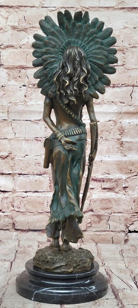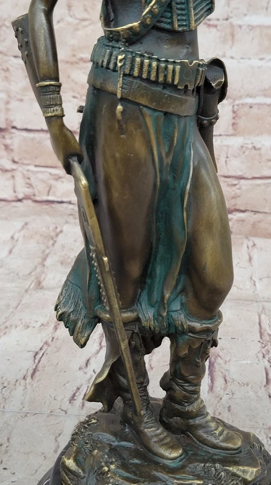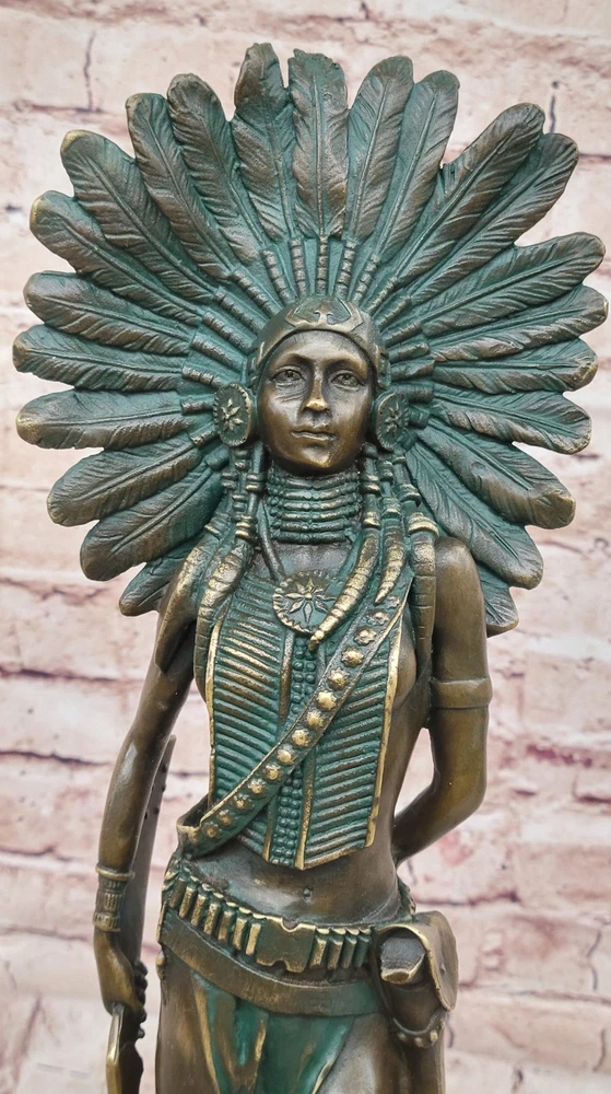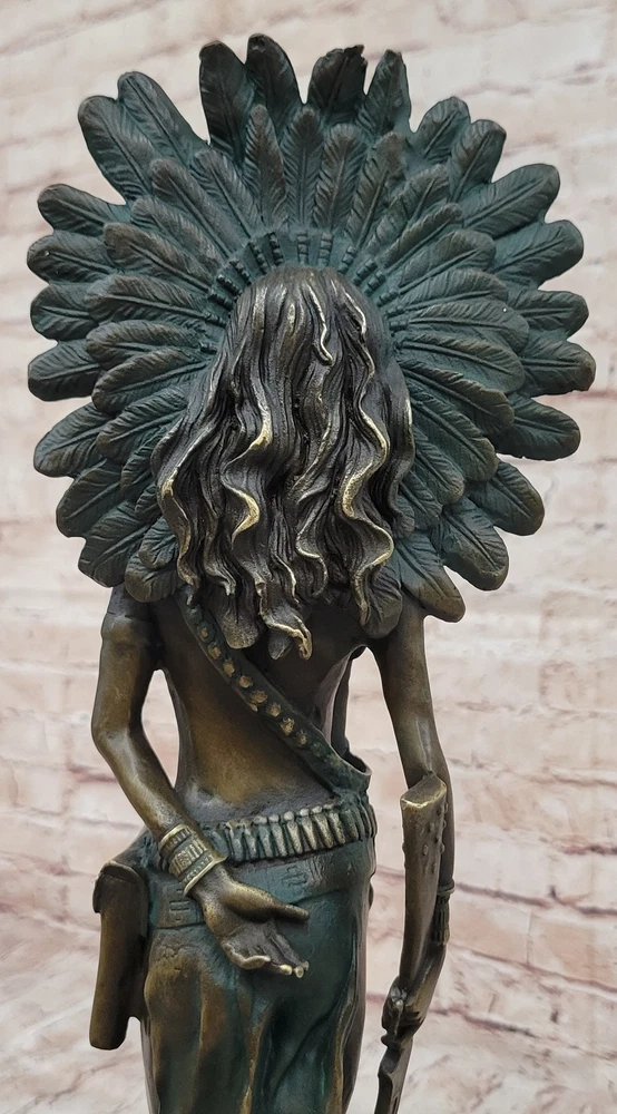 Condition : This sculpture is in perfect condition. Bronze Dimensions with Marble Base: Height 18" X Width 6" Marble Dimensions: Diameter 6" Height without base:16" Weight:13 LBS Inventory:26B0596662 Presenting an awe-inspiring depiction, behold the fierce Native American woman, poised for the hunt. With unwavering courage and silent confidence, she commands attention atop a grassy hill. Her regal presence is adorned by a magnificent eagle-feather and beaded war bonnet, its feathers standing tall in full display. A beaded choker adorns her neck while a gun belt, complete with a holstered pistol and bullet-lined waist, rests upon her hips. Her front and back are adorned with flowing cloth, revealing the length and curvature of her legs, while a beaded vest graces her chest, accentuating her slender frame. At her side, she holds a long rifle with her free hand gracefully tucked behind her, resting upon her rear. The intricate details of her thick, wavy mane cascade from the back of her war bonnet down her back. Completing her attire, she wears calf-high boots, tightly tied with a rope in the front. This remarkable sculpture captures her spirit, as she stands proudly not behind, but beside men. With a green patina gracing her accessories and a brown patina adorning her skin and boots, this 100% bronze sculpture is a true masterpiece. Meticulously crafted by hand using the renowned "Lost Wax Method," it embodies the utmost precision and detail. The sculpture is mounted on a round black marble base, providing stability and an elegant display. Each piece is personally signed by the esteemed artist, Milo. Don't miss the opportunity to own this extraordinary work of art that pays homage to the strength and beauty of the Native American culture. Native American Indian Female Warrior in Feathered Headdress Bronze Statue Sculpture by Milo EP-059 Video will open in a new window Using the eBay App? Paste link into a browser window: [isdntekvideo] A fierce Native American women prepares to hunt. She stands tall with bravery, silent confidence and stunning beauty on a grassy hill top. Her full eagle-feather and beaded war bonnet covers her head. The feathers round her head, fully extended upright. A beaded choker covers most of her neck. A gun belt is slung over her hips, with a pistol in the holster and extra bullets lining her waistline. Long cloth hangs between her thighs in the front and back, leaving the length and curve of her legs exposed. A beaded vest covers the front of her chest but leaves her sides and back bare, showing off her slender frame. She holds a long rifle to her side with her free hand tucked behind her, resting on her rear. Her thick, wavy mane hangs loosely from the back of her war bonnet, down her back. She A fierce Native American women prepares to hunt. She stands tall with bravery, silent confidence and stunning beauty on a grassy hill top. Her full eagle-feather and beaded war bonnet covers her head. The feathers round her head, fully extended upright. A beaded choker covers most of her neck. A gun belt is slung over her hips, with a pistol in the holster and extra bullets lining her waistline. Long cloth hangs between her thighs in the front and back, leaving the length and curve of her legs exposed. A beaded vest covers the front of her chest but leaves her sides and back bare, showing off her slender frame. She holds a long rifle to her side with her free hand tucked behind her, resting on her rear. Her thick, wavy mane hangs loosely from the back of her war bonnet, down her back. She