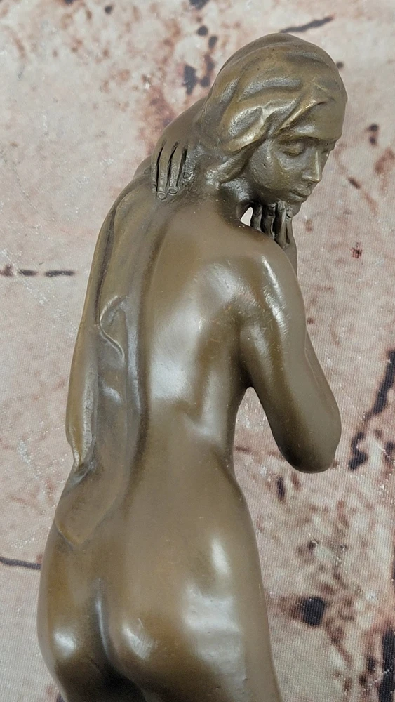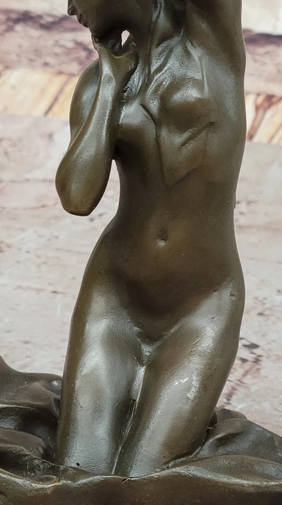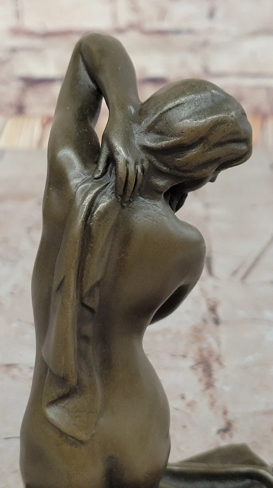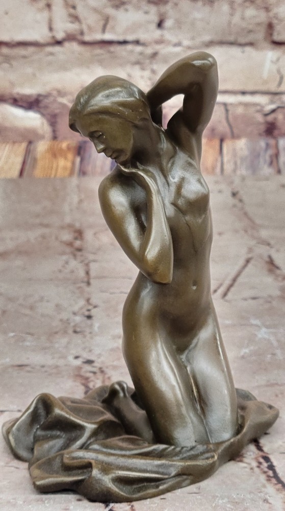 Condition : This sculpture is in perfect condition. Bronze Dimensions: Height 6" X Width 4.5" Weight:2 LBS Inventory:87EPA7004178 This stunning Art Deco bronze sculpture by renowned artist Mavchi beautifully captures the timeless elegance of the female form. The nude female figure is portrayed with graceful curves and refined details, embodying the sensuality and sophistication characteristic of the Art Deco era. Her poised stance and fluid lines evoke a sense of confidence and allure, making this piece a true celebration of femininity and artistic expression. Handcrafted using the traditional Lost Wax Method, this sculpture ensures exceptional quality and intricate detailing. The rich brown patina enhances the depth and dimension of the figure, highlighting the delicate contours and smooth finish that bring the artwork to life. The craftsmanship reflects Mavchi’s dedication to creating tasteful and evocative representations of the human form. Mounted on a sturdy base and signed by the artist, this exquisite bronze statue is a testament to fine artistry and classic design. Whether displayed in a home, gallery, or office, it serves as a captivating centerpiece that embodies the elegance and sophistication of the Art Deco period. Nude Female Figure Naked Girl Bronze Statue Sculpture Art Deco by Mavchi Artwork Video will open in a new window Using the eBay App? Paste link into a browser window: [isdntekvideo]