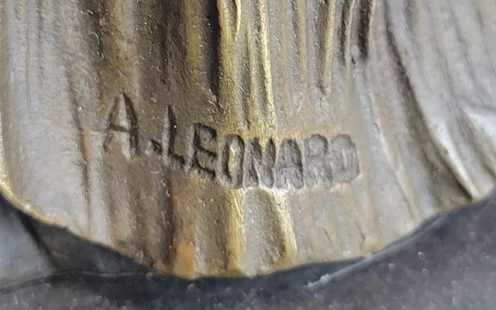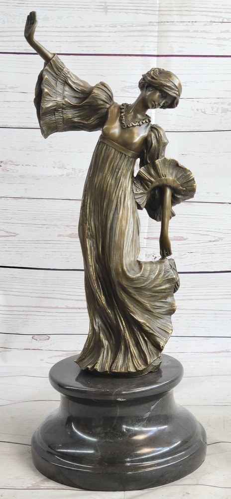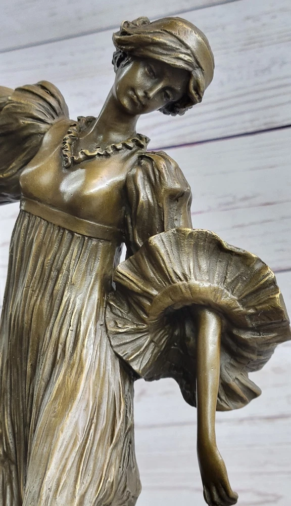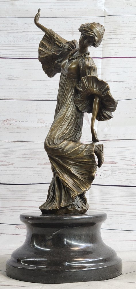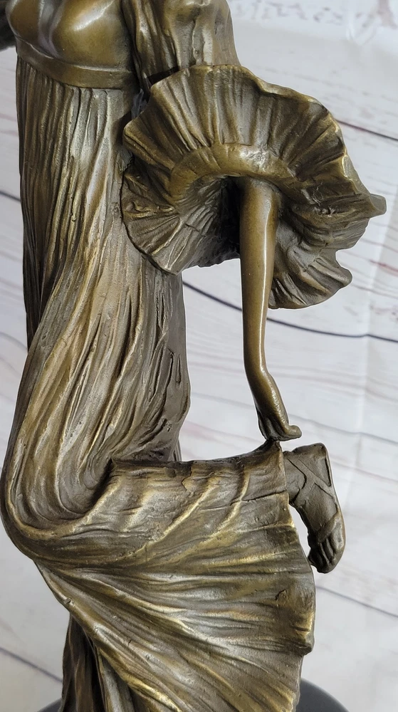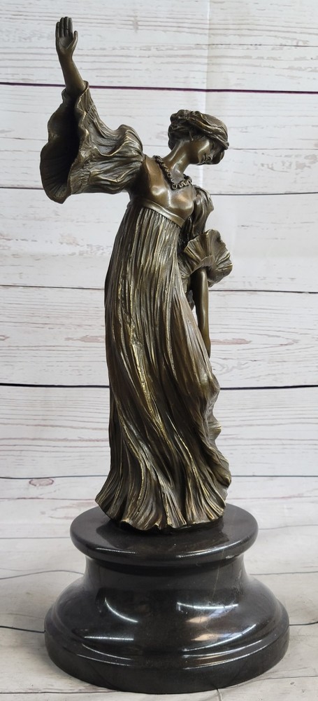 Condition : This sculpture is in perfect condition. Bronze Dimensions with Marble Base: Height 16" x Width 6.5" Marble Dimensions: Diameter 6.5" Height without base:13" Weight:12 LBS Inventory:18YDZ00887481 Capturing the essence of timeless elegance, this exquisite sculpture portrays a woman in a graceful stance, her left leg raised as she gazes downward. Dressed in an elaborate and conservative gown, the intricacies of the attire are highlighted, from the wide sleeves adorned with gorgeous ruffles to the crisscross design and layers around the legs. The attention to detail extends to the matching decorative hat that completes her unique look. Crafted using the ancient "Lost Wax Method," this sculpture is a testament to the artist's dedication to preserving the fine art tradition. The brown patina finish adds depth and character to the piece, enhancing its overall allure. Standing at 100% handmade bronze, the sculpture is mounted on a triple black marble base, further elevating its aesthetic appeal. This masterpiece is signed by the artist A. Leonard, adding a touch of quality and artistry to this captivating portrayal of timeless beauty. Display this sculpture as a focal point in your space, celebrating the enduring charm of classic artistry. Agathon Léonard "Danseuse Chantant" 100% Solid Bronze Figural Sculpture Statue Video will open in a new window Using the eBay App? Paste link into a browser window: [isdntekvideo]