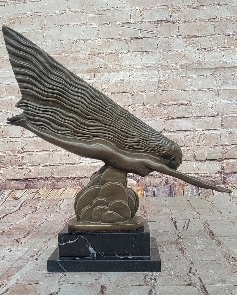 Condition : This sculpture is in perfect condition. Bronze Dimensions with Marble Base: Height 14" X Width 16" Marble Dimensions:6" X 4.5" Height without base:12" Weight:10 LBS Inventory:84RL03863448 This extraordinary Art Deco Bronze Statue, titled "The Comet," is a masterpiece created by the renowned artist Guiraud Riviére, known for his exceptional talent and artistic vision. The sculpture features a captivating scene of a nude woman with gracefully extended body and long hair resembling the tail of a comet cascading down her back. This bronze artwork captures the essence of beauty and elegance in a dreamlike form, showcasing intricate details and exquisite craftsmanship. Resting on a luxurious two-layered marble base, "The Comet" stands as an unparalleled piece in its class. The combination of the finest bronze material and meticulous casting process ensures a remarkable resemblance to the original artwork. Crafted with precision and attention to detail, this statue serves as a captivating focal point that demands attention in any exhibition or art display. With a commitment to quality, each step in the production of "The Comet" adheres to strict standards to guarantee the finest bronze articles. This ensures a truly exceptional piece that will stand the test of time, making it a coveted addition for collectors and enthusiasts of bronze sculptures and Modern Art. Embrace the allure of "The Comet" and let its mesmerizing beauty and timeless elegance enrich your collection or exhibition, captivating the admiration of all who appreciate the depth and beauty of bronze art. Signed Art Nouveau Nude Swimmer Bronze Sculpture Vintage Statue Figure Figurinenbsp; Video will open in a new window Using the eBay App? Paste link into a browser window: [isdntekvideo]