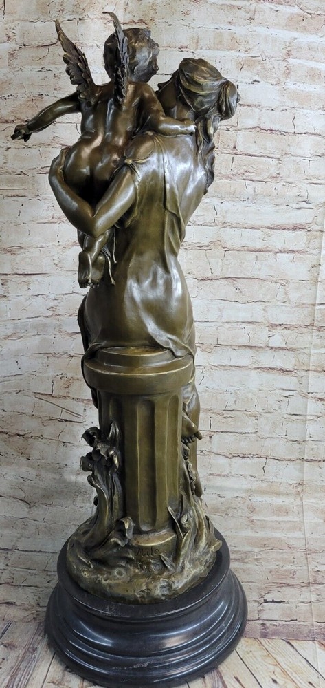 Art Deco Sculpture Angel Nude Woman Her Sleeping Cherub Baby Bronze Gift Art Deco Sculpture Angel Nude Woman Her Sleeping Cherub Baby Bronze Gift Condition : This sculpture is in perfect condition. Bronze Dimensions with Marble Base: Height 32" X Width 12" Marble Dimensions: Diameter 12" Height without base:28" Weight:75 LBS Inventory:97Y29128079 This exquisite sculpture portrays a beautiful woman seated atop a regal column, cradling a precious baby angel, or cupid, in her arms. The cupid holds an arrow, poised and ready to fly away, adding to the enchanting scene depicted in the sculpture. The column is adorned with intricate floral decorations at its base, enhancing the overall beauty and elegance of the piece. Standing on a black marble base, the sculpture exudes a sense of grandeur and sophistication. Crafted using the lost wax method, this large sculpture exhibits meticulous attention to detail and fine craftsmanship. Signed by the artist Milo, it is a timeless masterpiece that captures the grace and beauty of the human form and the innocence of childhood. 32" Tall Original Milo Nude Woman Holding a Baby Angel Bronze Sculpture Marble Video will open in a new window Using the eBay App? Paste link into a browser window: [isdntekvideo] Shipping Terms : Most of our items are shipped via USPS (United States Postal Service) mail or UPS. Most orders are shipped within 24-48 hours of purchase. Please be aware that not all items are available for USPS shipping due to size and weight. We do ship to Hawaii, Alaska, Canada, Puerto Rico, APO/AE, and U.S. Virgin Islands, however, an additional charge may be required. Please contact us before making any purchases in these areas. For Non-USA customers, you may be responsible for all duty, tax, brokerage fees that may be due upon delivery (shipping costs cover freight charges only). We also ship internationally. Please refer to the "Shipping and Handling" chart for the rates for each area. Payment : We accept just about any form of payment. PayPal, Master Card, Visa or American Express credit cards. Money orders, cashiers checks, and even personal or business checks. For governmental institutions, we will also accept a purchase order. Please understand that for personal or business checks we have to wait for the check to clear (usually 7 days) before shipping. Condition : New Detailed Hand Crafted Hot Cast Bronze Satisfaction Guaranteed. This is Stock Photo, Slight Color Variation!! Listing and template services provided by inkFrog