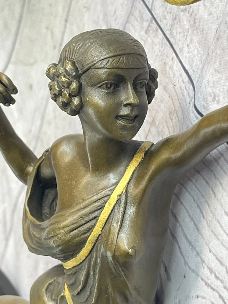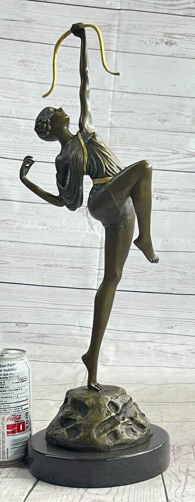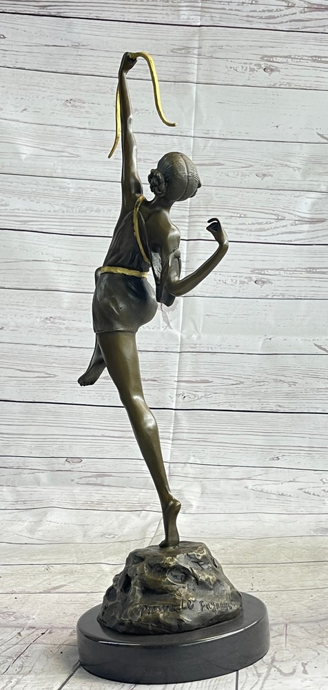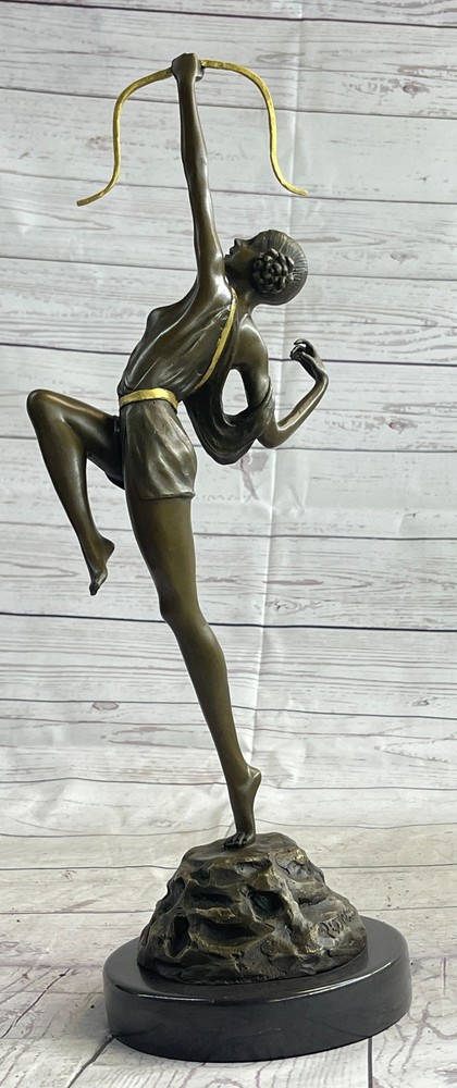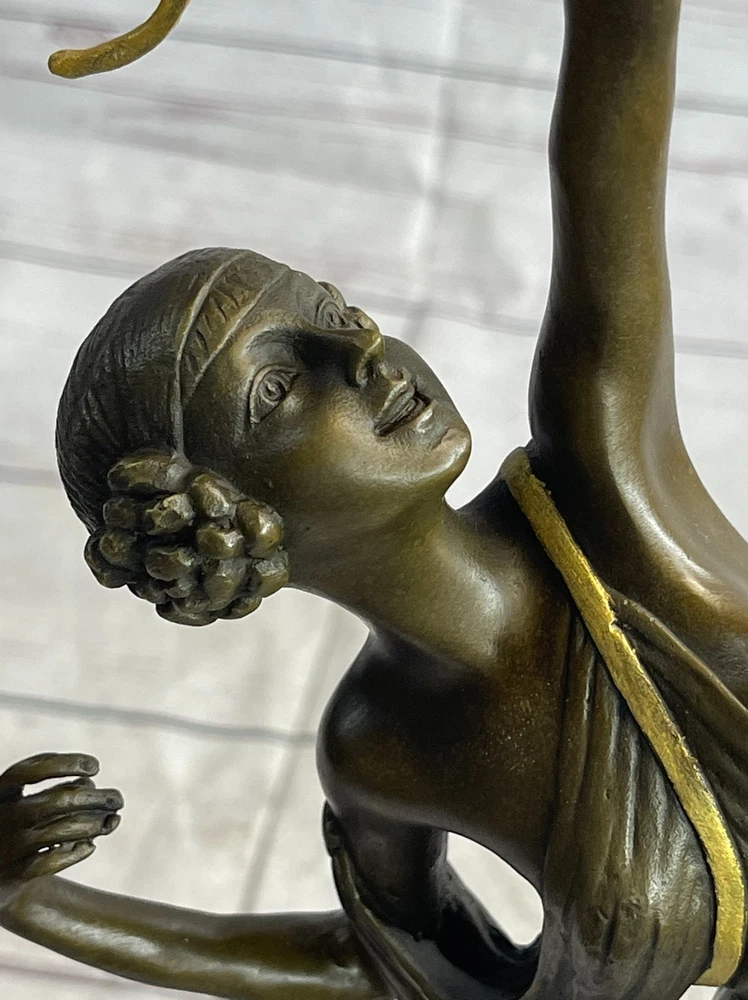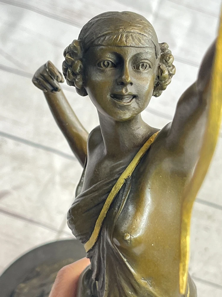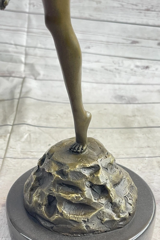 Condition : This sculpture is in perfect condition. Bronze Dimensions with Marble Base: Height 20" X Width 7 1/2" Marble Dimensions: Diameter 6" Height without base:19" Weight:10 LBS Inventory:18B461J5881 Crafted by the skilled hands of French artisan Pierre Le Faguays, this sculpture stands as an exquisite and detailed representation of the Greek goddess Diana. In Roman mythology, Diana was revered as the goddess of the hunt, associated with wild animals, woodlands, and the moon. This particular piece captures Diana in an arabesque-like pose, radiating immense strength and grace. The attention to detail is evident in the flowing drapery of her gown and the intricate floral-shaped headpiece adorning her ears, framing a young face filled with absolute jubilation. The artist's masterful portrayal of Diana draws inspiration from the statues of Tanagra, showcasing originality and grace. The sculpture reflects the classical elegance and timeless beauty of this revered goddess. As the twin sister of Apollo, Diana's divine lineage is highlighted, with Jupiter and Latona as her parents. The significance of Diana in ancient Roman religion endures, with shrines dedicated to her found in Capua and Aricia. The base of the sculpture bears the signature "Pierre Le Faguays," a testament to the artist's acclaim. Crafted in bronze and set atop a black marble base, this piece is more than a mere sculpture; it's a timeless treasure. The fine craftsmanship, attention to detail, and the inherent beauty of Diana's portrayal make it a must-have for art enthusiasts and collectors alike. Awarded a medal of honor in 1927, Pierre Le Faguays' legacy lives on through this captivating representation of the goddess Diana, a symbol of strength, nature, and divine grace. Artemis Diana the Huntress Female Archer Bronze Statue Sculpture Art Deco EP-461BG Video will open in a new window Using the eBay App? Paste link into a browser window: [isdntekvideo]