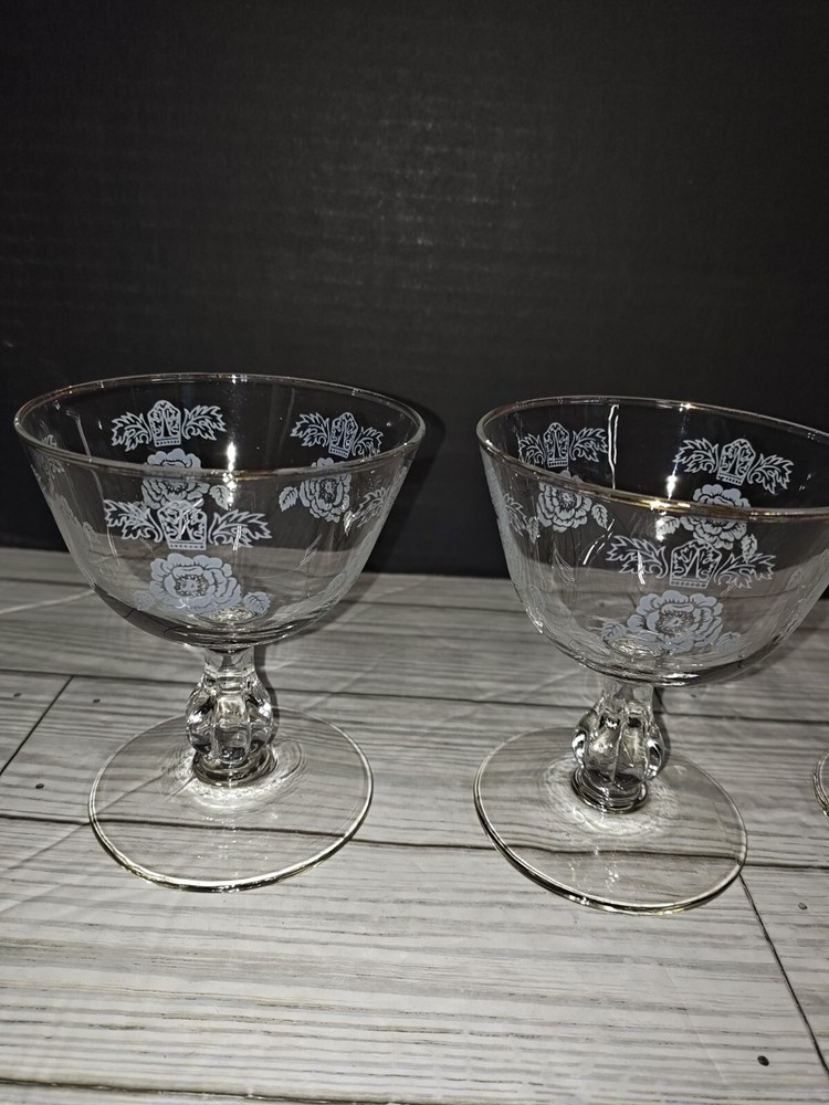 Art Nouveau Floral Design Glass Champagne Sherbet Coupe Goblets Set of 3. Has wear from age use and storage. See pictures. Sold as is.