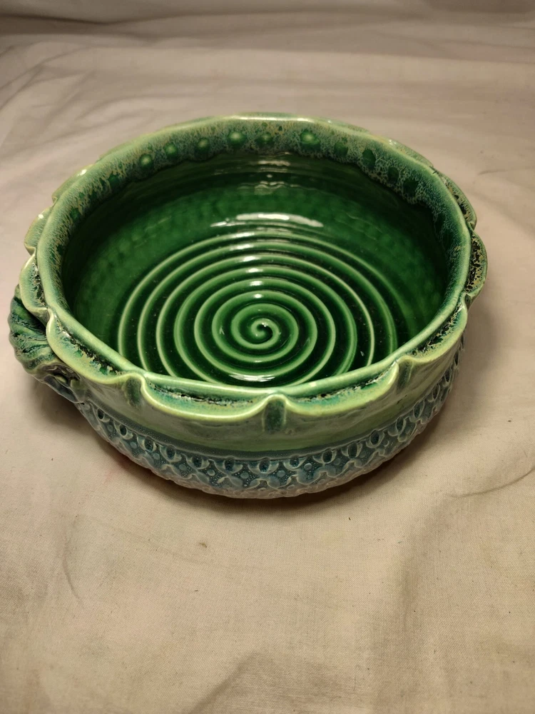 Earthen Clay Pot 7" Pottery Vintage North Carolina USA Wonderful handmade pot with raised relief and a beautiful combination of colors and patterns. The artist Hope Fregerio hails from Charlotte North Carolina. The pot measures just over 7 inches in diameter and 3 inches tall. Signed on base.