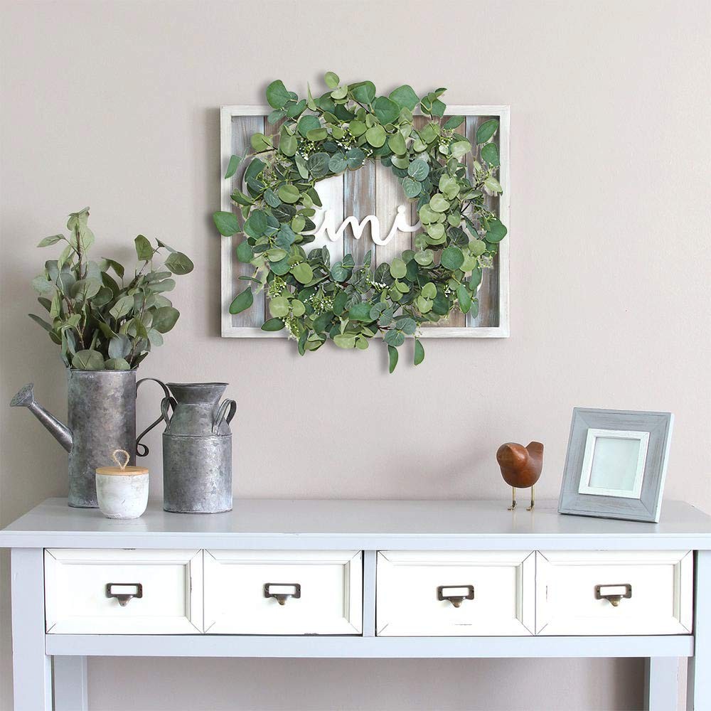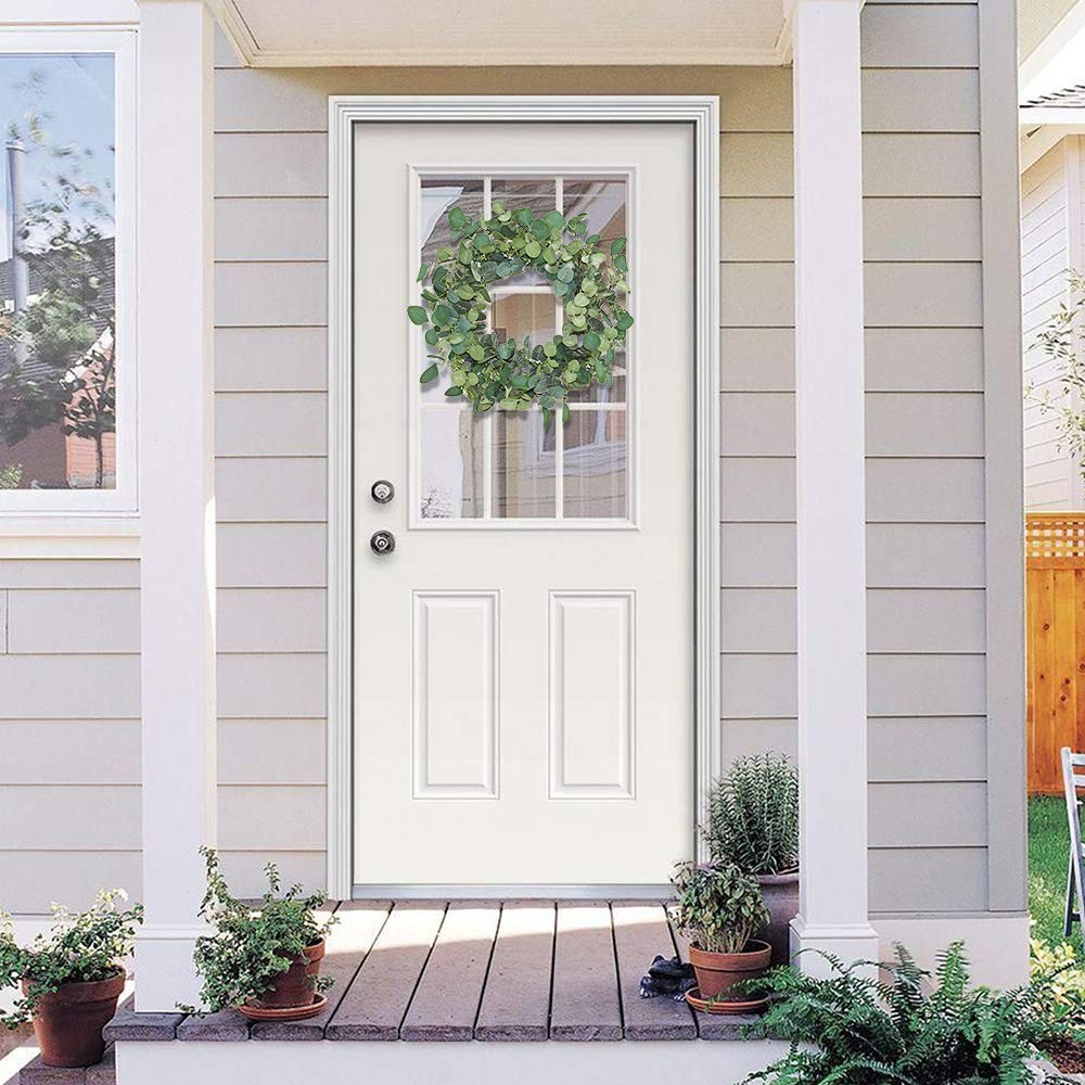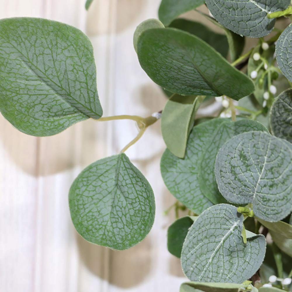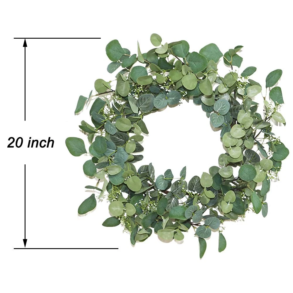 20 Inch Artificial Eucalyptus Wreath This beautiful artificial eucalyptus wreath can be as Valentines Day Wreath, Easter Wreath,and Fall Wreath and Winter Wreath as your expectations.The wreath can be used indoors or outdoors,it can hang on window and wall too. The beautiful wreath will bring an enjoyable ambiance all year round. Key Features: 20 Inch real size wreath Just easily adjust the stems, this green wreath will display as a 20 inches large green wreath, absolutely large enough as a front door wreath. Silk flowers and leaves The flower wreath is made from artificial silk eucalyptus leaves and flowers that cover fully on the wreath base, mixed with mini leaves. High quaity and good package! The wreath will never wither and you can clean them with water in any time you want. This is not recommended to put it outside on your front door with direct sunlight. The wreath will arrive to your doorstep packed in a storage box to protect the wreath and for seasons to come. 【External Diameter】-- 20 inch (Need to adjust leaves stem after take the wreath out of package). 【Decorative Eucalyptus Wreath】-- This fake eucalyptus wreath create a romantic look that makes for a wonderful style, can use it every season! Elegant and vivid color make for a timeless seasonal home décor. 【Unique Design】-- Artificial green wreath is handcrafted on a light-weight wreath base with faux eucalyptus leaves and seeds. Never wither and always keep green. 【Versatile】-- Fake eucalyptus wreath can be used indoor or outdoor making it a versatile decorating accessory. Hang it above your fireplace, place it on your front door. Perfect for decorating weddings, stages, parlours, bedrooms, offices, dining rooms, birthdays, and others. 【Maintenance】-- Silk leaves and real twigs vine wreath base, keep out of direct sunlight and rain. Easy to clean and .
