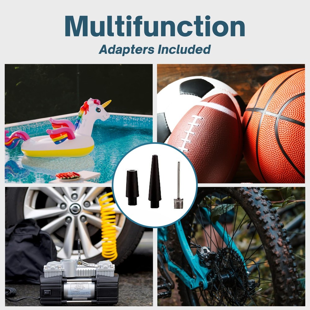 Experience swift tire care with 's advanced 12V double-cylinder tire pump, inflating in under 2 minutes, four times faster than standard compressors. Designed for trucks, cars, and SUVs, its maximum 150 Psi ensures efficient tire inflation on the go. The complete tire care kit, tailored for trucks, includes an 11.5ft extension hose, versatile nozzles, spare fuse, robust cables with clamps, and a travel-friendly bag. Compact at 8.7” x 7.1” x 3.1”, it ensures hassle-free portability for your tire care needs. Illuminate and inflate with ease using 's 12V tire air compressor, equipped with a bright LED light for visibility in low light conditions. Rely on the dial pressure gauge for accurate inflation, making it your go-to for precise tire care, day or night. This versatile performer caters effortlessly to SUVs, trucks, RVs, bicycles, and more, providing multiple adapters for a perfect fit. Connect it to your car battery or cigarette lighter for a power-up that suits your convenience. RAPID INFLATION: Our 12V double cylinder tire pump inflates in under 2 mins, 4X faster than standard compressors. Maxing at 150 Psi, it's perfect for trucks, cars, and SUVs. Compact for travel, it ensures quick, efficient tire inflation every time. COMPLETE TIRE CARE KIT: Our 12V air compressor, tailored for truck tires, includes an 11.5ft extension hose, various nozzles, spare fuse, robust cables with clamps, and a travel-friendly bag. Compact at 8.7” x 7.1” x 3.1” for hassle-free portability. ILLUMINATE & INFLATE: Enhance your tire care with 's 12V tire air compressor. Bright LED light ensures visibility in low light. Trust the dial pressure gauge for accurate inflation. Your go-to for precise tire care, day or night. VERSATILE PERFORMANCE: 's tire inflator with gauge effortlessly suits SUVs, trucks, RVs, bicycles, and more. Multiple adapters ensure a perfect fit. Connect to your car battery or cigarette lighter for easy power-up. DURABLE CONSTRUCTION: Crafted with robust metal for exceptional durability, 's electric air pump boasts a rust-resistant pure copper connector and noise-reducing rubber feet. Choose enduring quality for your tire care needs.