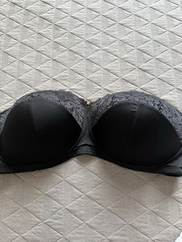 This Ashley Stewart strapless bra features a beautiful floral pattern in black color. The bra is designed with wireless support, padded cups, and a hook & eye closure. It is available in size 42H and is part of the Lane Bryant Cacique product line. This modern bra is perfect for any woman looking for comfortable and stylish support. No straps are included.