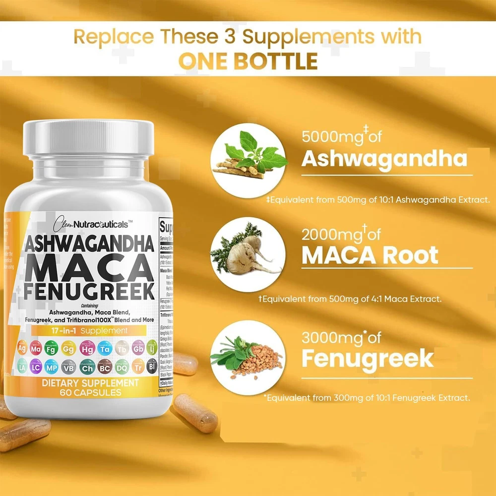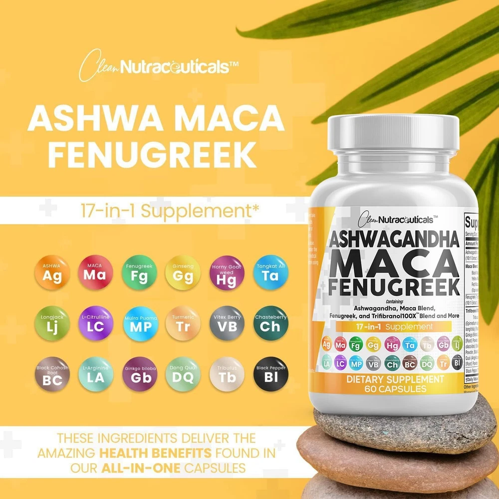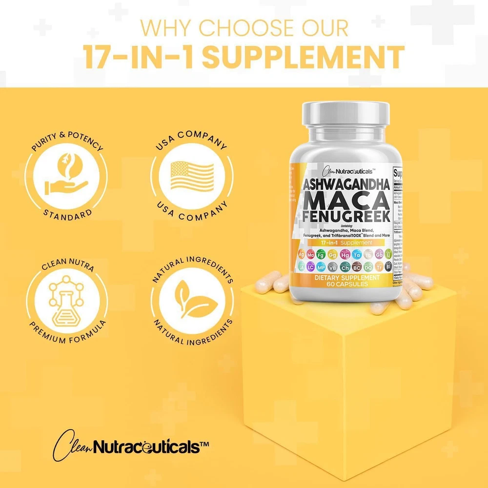 Advanced Ashwagandha Supplements for Mood Support - Our Ashwagandha Root Capsules contain 17 powerful ingredients such as Black Maca Root Powder, Red Maca Root Powder, Yellow Maca Root Powder, and Fenugreek Seed. Maca Capsules have been combined with Fenugreek Pills and Ashwagandha Pills to make one of the world's most inclusive 17 in 1 Stress Relief Supplement available. This is a potent alternative to ashwagandha gummies, maca coffee, fenugreek tea, and maca root gummies. The Ultimate Ashwagandha Extra Strength with Maca Root Capsules You've Been Looking For - Clean Nutra's Internal Fire provides 3 full-dose Herbal Supplements in one, containing a full Pure Maca Root, Fenugreek Capsules, and Ashwagandha Root in a convenient 2 capsule dosage. Stronger than Ashwagandha 400mg and Ashwagandha 300mg. Finally, Red Maca Root Capsules for Women and Black Maca Root Capsules For Men have been combined into one solution that also contains a Fenugreek Supplement. Introducing The Trifibranol100X Blend - In addition to Fenugreek Seeds Capsules and Maca Root Pills, our formula also contains over a dozen more powerhouse ingredients such as Tongkat Ali and Red Panax Ginseng Extract. This powerful Mood Support Supplement also has Black Pepper Extract to help maximize absorption and effectiveness of all 17 ingredients. Many prefer this when compared to aswagandhada capsules, aswagandha gummies, fenugreek seeds organic, organic maca, and ashwagandha organic. Powerful Combination Of Natural Herbs & Roots - Internal Fire is overflowing with potent pure ashwagandha, maca ginseng, and fenugreek supplements. Clear out those countless ayurveda products in your supplement cabinet and replace it with just 2 capsules per day. In addition, fenugreek capsules for women are also used as breastfeeding supplements and for lactation support. Better alternative to plain organic ashwagandha capsules, maca coffee for men, ashwagandha for men, and maca root for women. Vetted and Trusted Ingredients - We pride ourselves in offering quality stress supplements for our customers. Our maca supplement formulas are proudly made in a registered and certified facility. Some other common names and forms are ashwangha supplements, maca powder organic for women, maca root for men, maca ginseng for men, macca root, maca root liquid drops, organic maca root capsules and black maca for men.