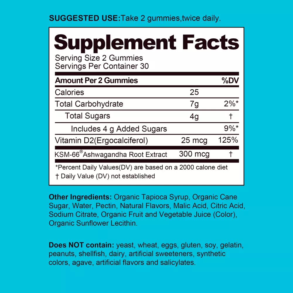 Effects: Positive Emotions, Relax, Calm, Sleep Support Ingredients: Ashwagandha Directions: Take 2 gummies once daily after a meal. Shipping: Ships within 48 hours on working days. Shelf life: 2 years Description: Powerful Ashwagandha Extract: Ashwagandha has been traditionally used as an adaptogen, a natural substance that helps the body naturally adapt to stress. Ashwagandha helps improve memory and concentration, maintain quality of life, and help you relax deeply and find a positive mindset. Ashwagandha helps maintain normal cortisol levels, reduces stress, promotes physical relaxation, lowers cortisol levels, suppresses appetite and improves sleep quality. This is a supplement that protects you year-round, supports your overall health, and is plant-based, vegan, non-GMO, and gluten-free. Document