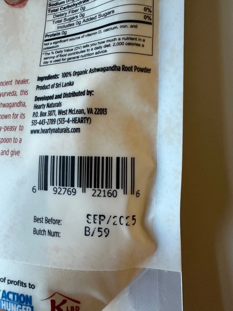 Formulation:PowderFlavor:AshwagandhaVolume:4 ozCalories per Serving:5Brand:Hearty NaturalsCustom Bundle:NoServing Size:0.5 tbspType of Diet:Ayurvedic, Kosher, Non-Vegetarian, Pescatarian, Vegan, VegetarianActive Ingredients:Ashwagandha PowderNumber of Pills:does not applyNumber of Servings:90Ingredients:AshwagandhaType:Green Food/SuperfoodFeatures:OrganicMain Purpose:Adrenal Support, Energy Support, General Wellness, Immune Support, Stress ManagementDepartment:UnisexMPN:does not applygtin13:692769221606Food Specifications:OrganicUPC:692769221606Expiration Date:02/2025Item Weight:4 ozWhen to Take:After Meal, Afternoon, Before Meal, Morning, Night