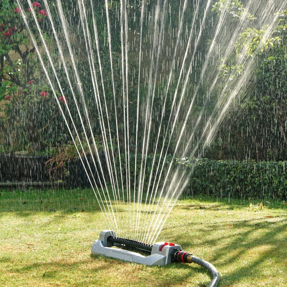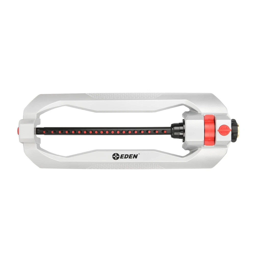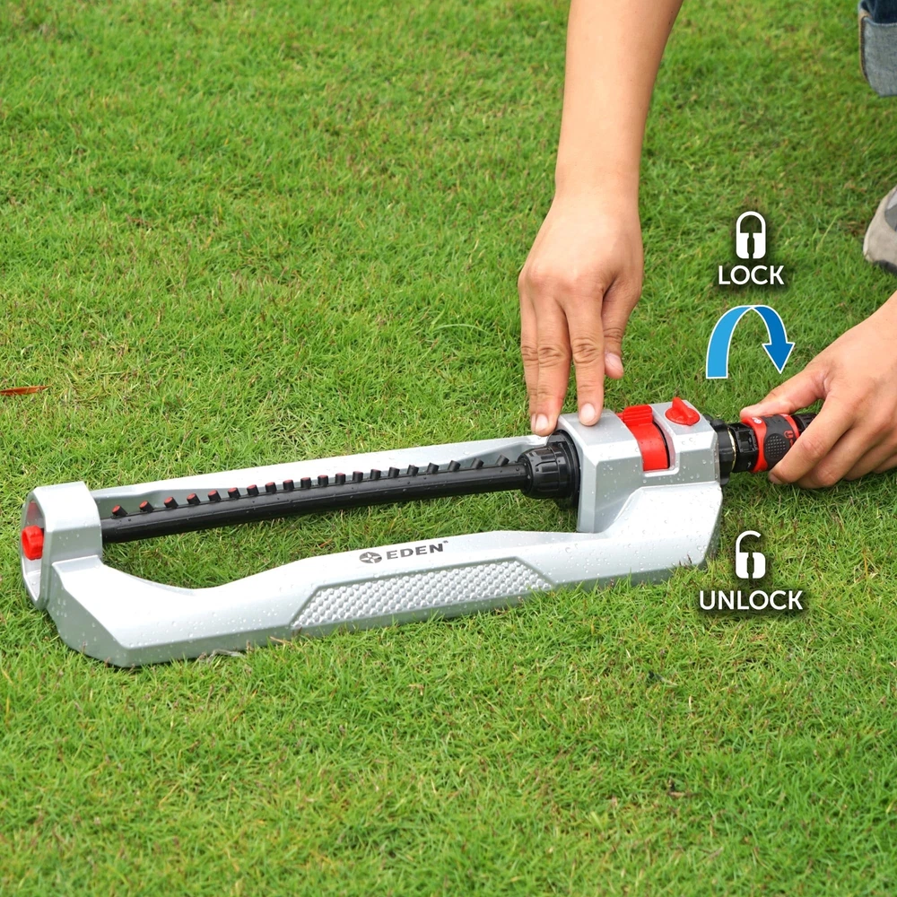 Eden 94111 Lawn&Garden Metal Oscillating Water Sprinkler for Yard W/Quick Connect Starter Set 4,400 Sq Ft Coverage, Heavy Duty Product Details Brand: Eden Color: Metal Material: Metal Style: Oscillating Item dimensions L x W x H: 18.39 x 6.77 x 3.27 inches Brand: Eden Color: Metal Material: Metal Style: Oscillating Item dimensions L x W x H: 18.39 x 6.77 x 3.27 inches Manufacturer: Eden UPC: 737677941113 Number of Items: 1 Product Dimensions: 18.39 x 6.77 x 3.27 inches Item Weight: 2.29 pounds Country of Origin: Taiwan Item model number: 94111EDAMZ For your immediate usage. Attaches directly to garden tap and simply turn on the water. Provide maximum coverage of large lawns or gardens Makes coverage adjustments simple To keep the nozzles clean and assure years of reliable operation Ensures smooth operation regardless of water pressure for reliable performance and a longer gear life Quick Connect Starter Set fits all standard garden hoses and tools Durable metal base gives added weight for more stability, sturdiness, and durability. The anti-rust coating and durable construction will last season after season. Experience unmatched durability and control with the metal base of Eden 20 Nozzle 2-Way Oscillating Sprinkler, offers a turbo drive motor and 20 precision drilled nozzles to deliver consistent watering for lawns, vegetable gardens, and flower beds. Adjust the rectangular spray pattern to achieve superior coverage up to 3,778 sq. ft. (350m²), providing thorough watering for medium-large lawns or smaller garden areas. The patented sealed turbo drive motor ensures smooth operation, delivering reliable performance and a longer gear life. Say goodbye to clogged nozzles with the built-in cleaning tool, allowing for years of hassle-free operation. Adjustment levers are easy to use to provide precision watering– from a large lawn to a smaller garden. The flow control knob regulates water pressure. Our patented, sealed turbo drive ensures smooth operation regardless of water pressure for years of reliable performance. The included Quick Connect Starter Set allows you to easily disconnect/reconnect the sprinkler or other watering tools. The lock feature secures the sprinkler in place, preventing any accidental detachment. Use the additional Product Adapter for your nozzles, wands, or other watering tools to switch between tools, even with the water running. Transform your lawn and gardens into vibrant, lush spaces with the powerful and efficient Eden Metal 20 Nozzle 2-Way Oscillating Sprinkler.