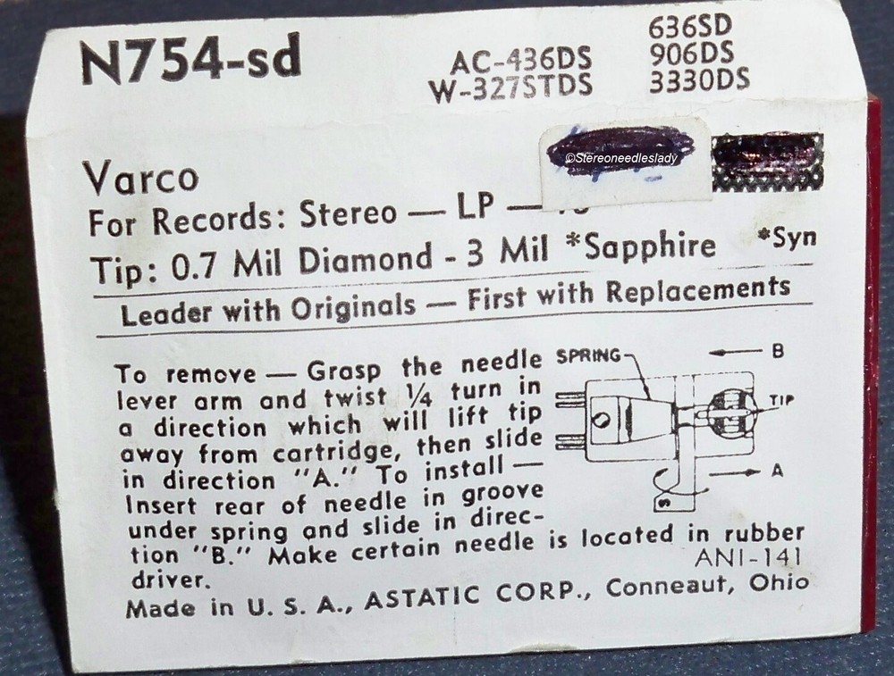 Phonograph needle stylus Astatic N754-sd, 862-DS73, replaces: Vaco Varco LPS-D NTO-9-DS LPS TN NTO-9-SS. Used in: Vaco TN-02-H TN-02-HD TN-20. Tip: .7 mil diamond and 3 mil synthetic sapphire. Speeds: 33, 45 & 78 RPM. New old stock. PS-101 AC-436DS W-327STDS 636SD 906D/S 3330DS Search my store titles AND descriptions. Enter your needle no., cartridge no., or brand name. E-mail for further help. IF YOU ARE PURCHASING A NEEDLE Model numbers are provided in manufacturer's references for the cartridge they installed in those models. If the cartridge has been changed by a dealer or user, this needle will not be correct for the model numbers listed, as it is the cartridge that determines what needle is needed. Be sure it looks like your old needle.