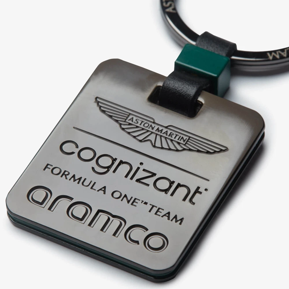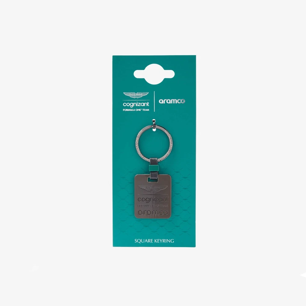 Introducing the Aston Martin Aramco Cognizant Formula One Team Official branded Square Keyring. With a gunmetal finish the AMF1 Team logo on one side and the team name laser etched onto the ring, this keyring is a great piece to add to your set.