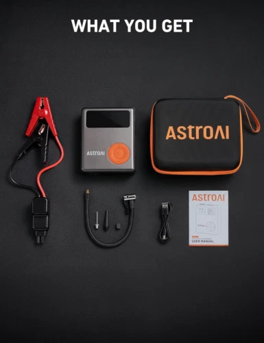 AstroAI Portable Car Jump Starter with Air Compressor, 150PSI 1750A Car Jumper Starter Battery Pack with Cordless Tire Inflator (7.5 Gas/5.0L Diesel), 12V Jump Box, Large LCD Display, Lights Product Details Brand: AstroAI Product Dimensions: 4.9"D x 6.1"W x 1.9"H Item Weight: 1.9 Pounds Amperage: 1.75E+3 Amps Peak Output Current: 1750 Amps Manufacturer: AstroAI Item Weight: 1.9 pounds Item model number: DK-MF139 Batteries: 1 Lithium Polymer batteries required. (included) Manufacturer Part Number: DK-MF139 Brand: AstroAI Product Dimensions: 4.9"D x 6.1"W x 1.9"H Item Weight: 1.9 Pounds Amperage: 1.75E+3 Amps Peak Output Current: 1750 Amps Battery Cell CompositionVoltage: Lithium-Nickel Manganese Cobalt (NMC)12 Volts Vehicle Service TypeBattery Capacity: Various Vehicle Types12000 Milliamp Hours START COMPLETELY DEAD BATTERIES - With a built-in 60c of extreme power and a 1750A peak current, this jump starter battery pack can start 7.5L gas and 5.0L diesel engines quickly and efficiently, even if the battery is below 9V. Also compatible with 12V vehicles like motorcycles, cars, SUVs, trucks, and lawnmowers; even in extreme temperatures (-4°F~122°F). EFFICIENTLY INFLATE TIRES- Inflates leaky tires from 32PSI to 36PSI in just 60s. The built-in 150PSI air compressor is professionally calibrated to always return an accurate reading within 1% of the exact tire pressure. It includes an extension air hose and 3 different nozzles to inflate cars, bikes, balls, and other inflatables. NOTE: THE AIR TUBE WILL BE HOT AFTER INFLATION, PLEASE WAIT A MOMENT TO REMOVE. PRESET TIRE PRESSURE & AUTO SHUTOFF - The preset mode allows you to set the tire pressure anywhere, eliminating the need to squint under the scorching sun. It will automatically shut off once it reaches the preset value. Inflate with confidence and safety, without worrying about overinflation. COMPACT & PORTABLE - With an overall size of 6.1*4.9*1.9 inches and a total weight of 1.9lbs, it is very easy to keep in a car or carry in a travel bag. Compared with bulky lead-acid jump starters, this compact portable jump starter brings more convenience and peace of mind to road trips. 3.7" VISIBLE LCD & LED DISPLAY - Compared with traditional jump starters that only have analog indicators, the AstroAI car jump starter's visible LCD & LED clearly display all relevant information. If you get stuck on a road trip with a dead battery, you won't have to guess with clunky indicators or anxiously wait hours for roadside assistance on desolated interstates. Just follow the instructive steps on the screen to save yourself easier and safer. 6-IN-1 MULTI-FUNCTION - The AstroAI Lithium portable jump starter for car battery includes 6 integrated functions. It's a car jump starter, air compressor, portable 12000mAh power bank and an LED flashlight with 3 modes (Stable, Strobe, SOS). This 6-in-1 multi-function tool is a must-have in any road trip kit.